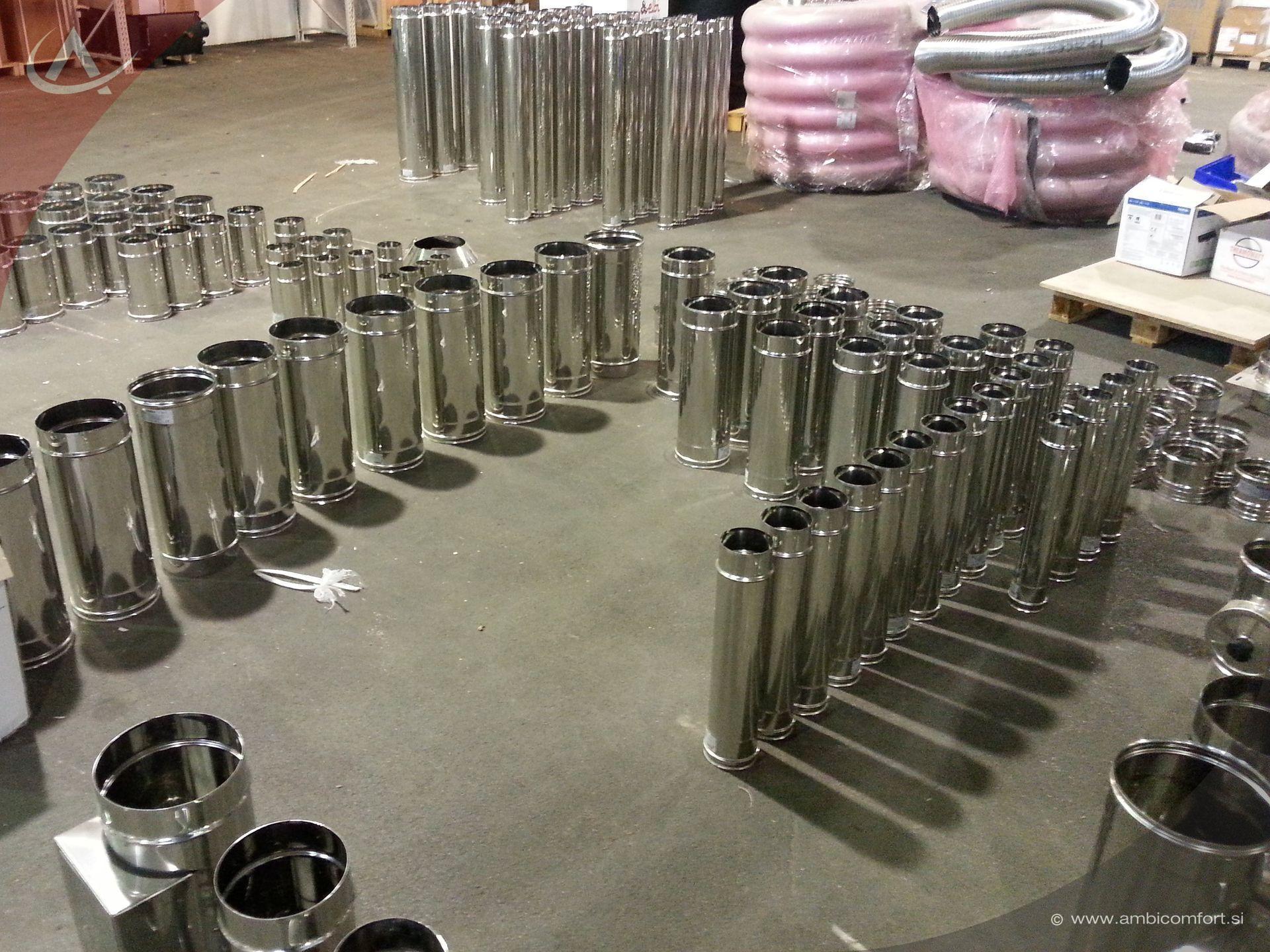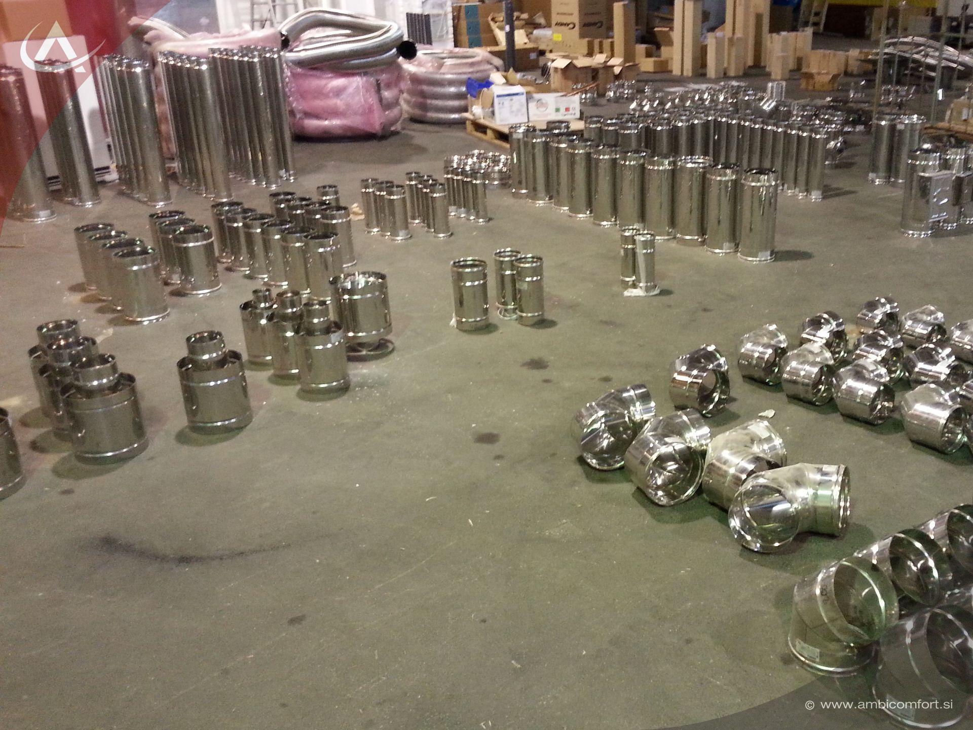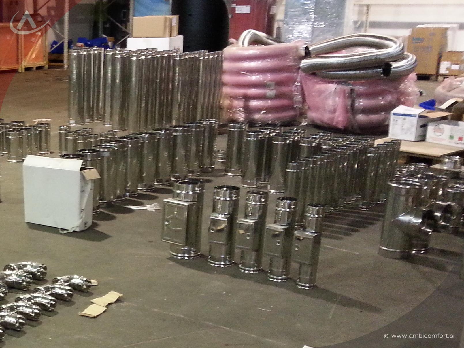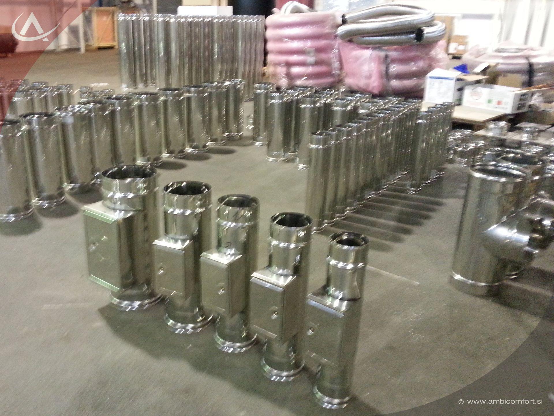 Popolna ponudba dimnih cevi, dimnih kolen, nosilcev, čistilnih elementov in dimniških kap z notranjim premerom od 80 mm do 300 mm.