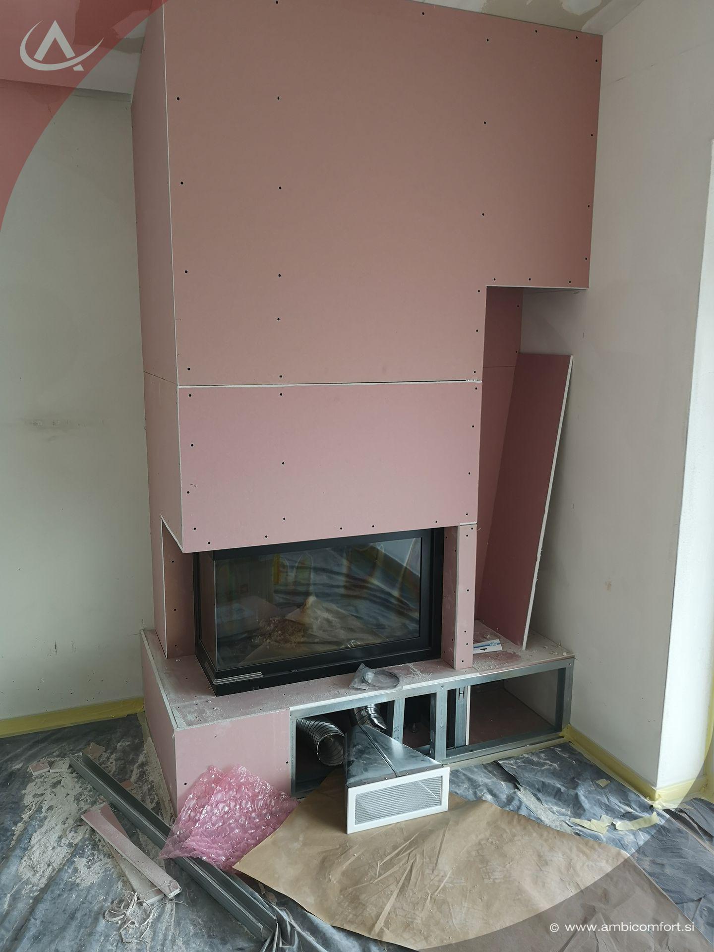 Kamin na drva z velikim kuriščem v izvedbi monoblok pripravljen za izdelavo obloge.