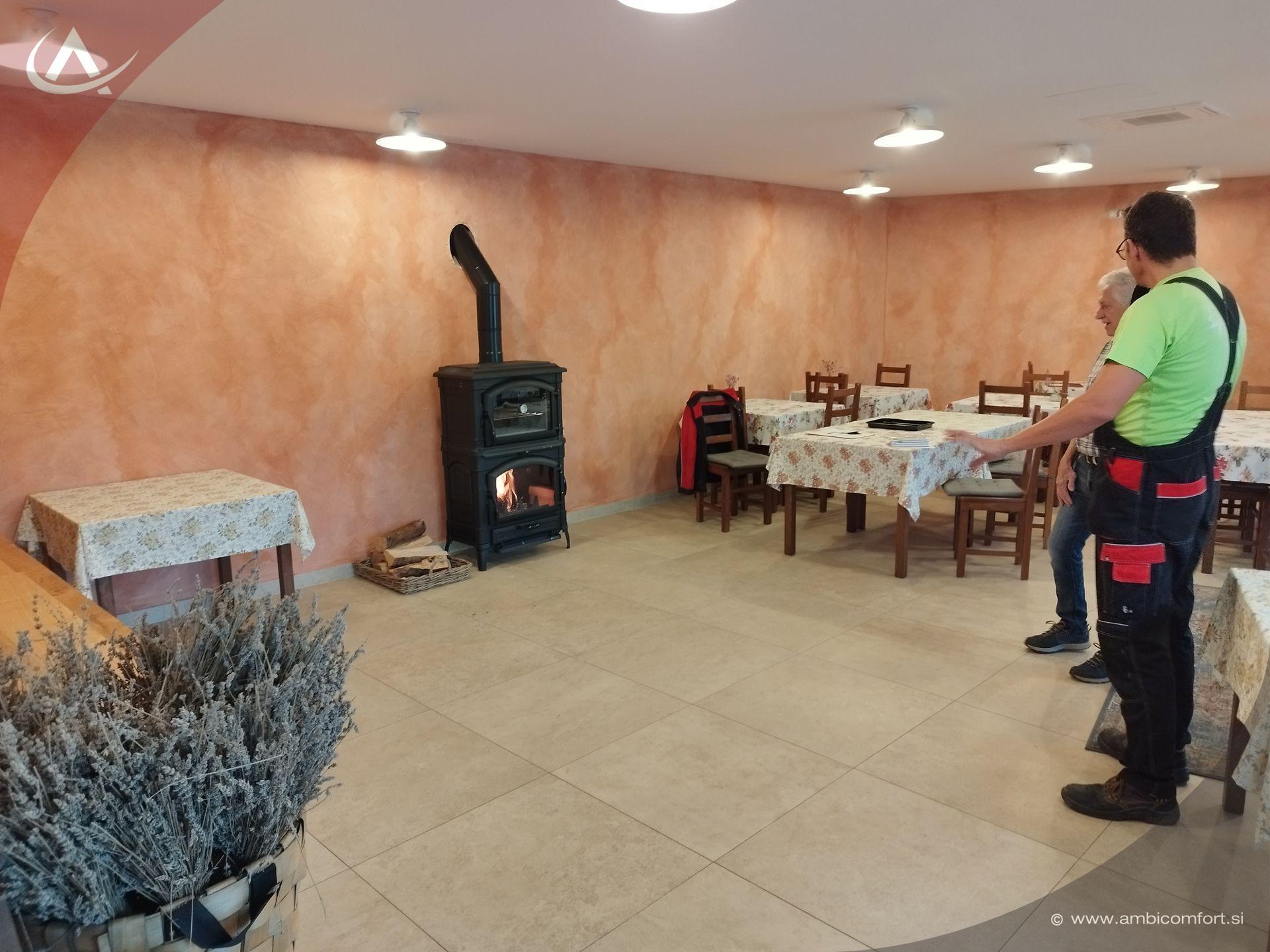 Jedilnco kampa Brda je obogatila prostostoječa kaminska peč na drva Isotta Forno, ki ima zunanjost v celoti izdelano iz litega železa. Na sprednji strani peči so nalagalna vrata, ki vsebujejo ploščo iz keramičnega stekla, ki prenese temperature do 750° C. Manjša nalagalna vrata so tudi na desni strani peči. Pokončno kurišče je izdelano iz litega železa s sistemom za naknadno zgorevanje. Na vrhu je 39 literska panoramska pečica z notranjostjo izdelano iz vulkanskega kamna.