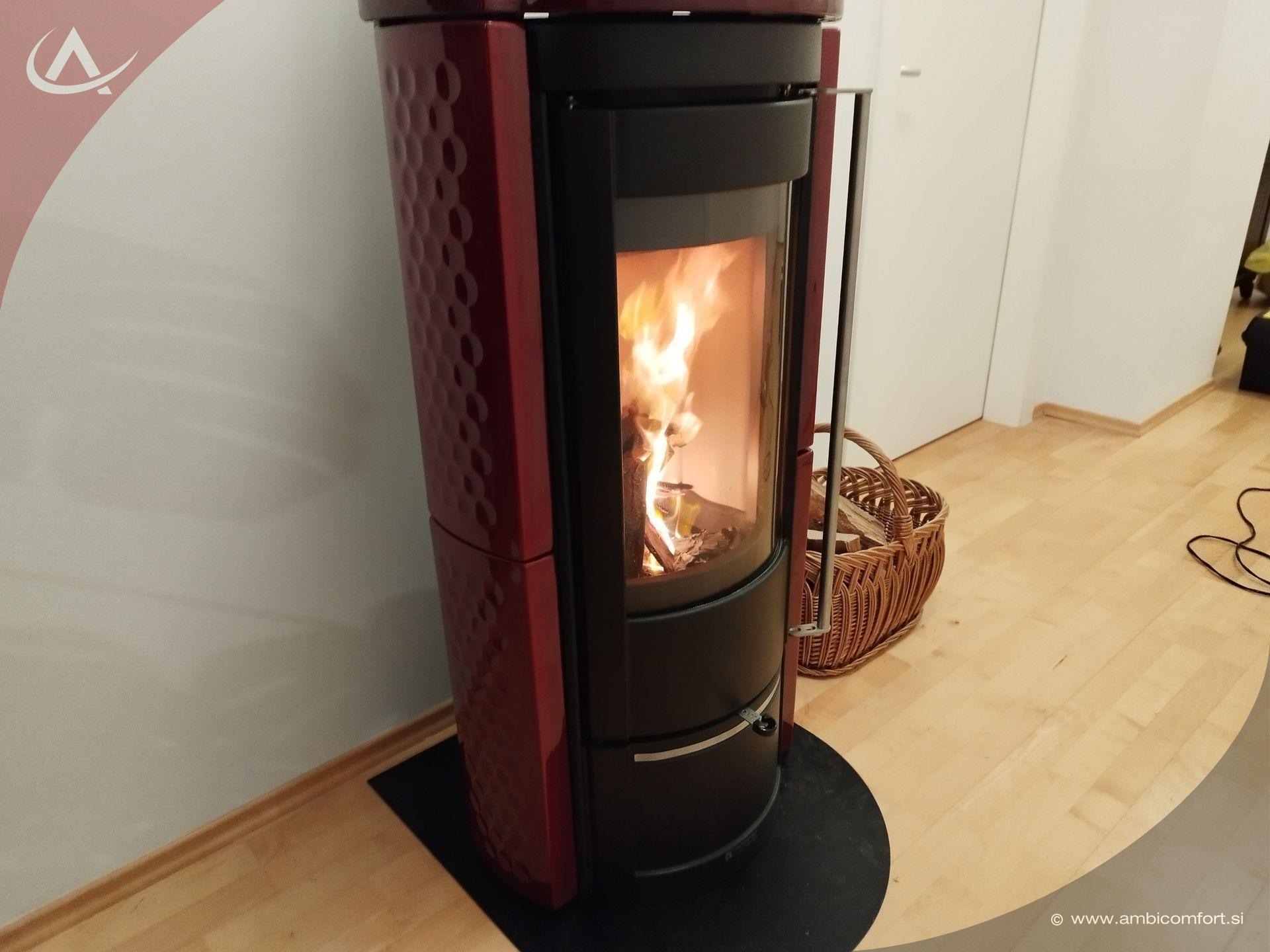 Rdeča keramična obloga poživlja prostor in poudarja eleganco v prostoru. Dolga vzdolžna ročica vrat kurišča nekoliko dopolni sodobno obliko z retro dizajnom.