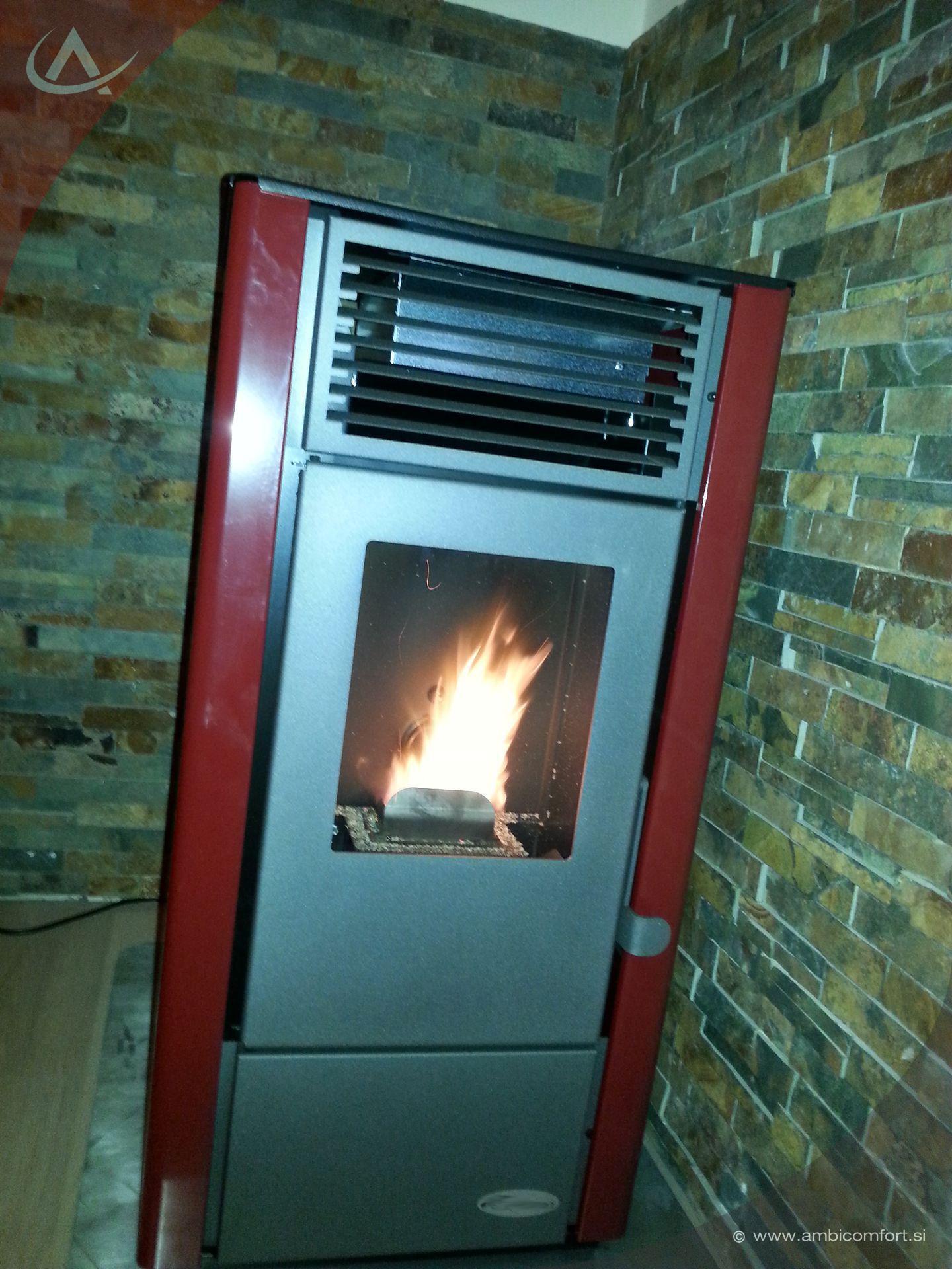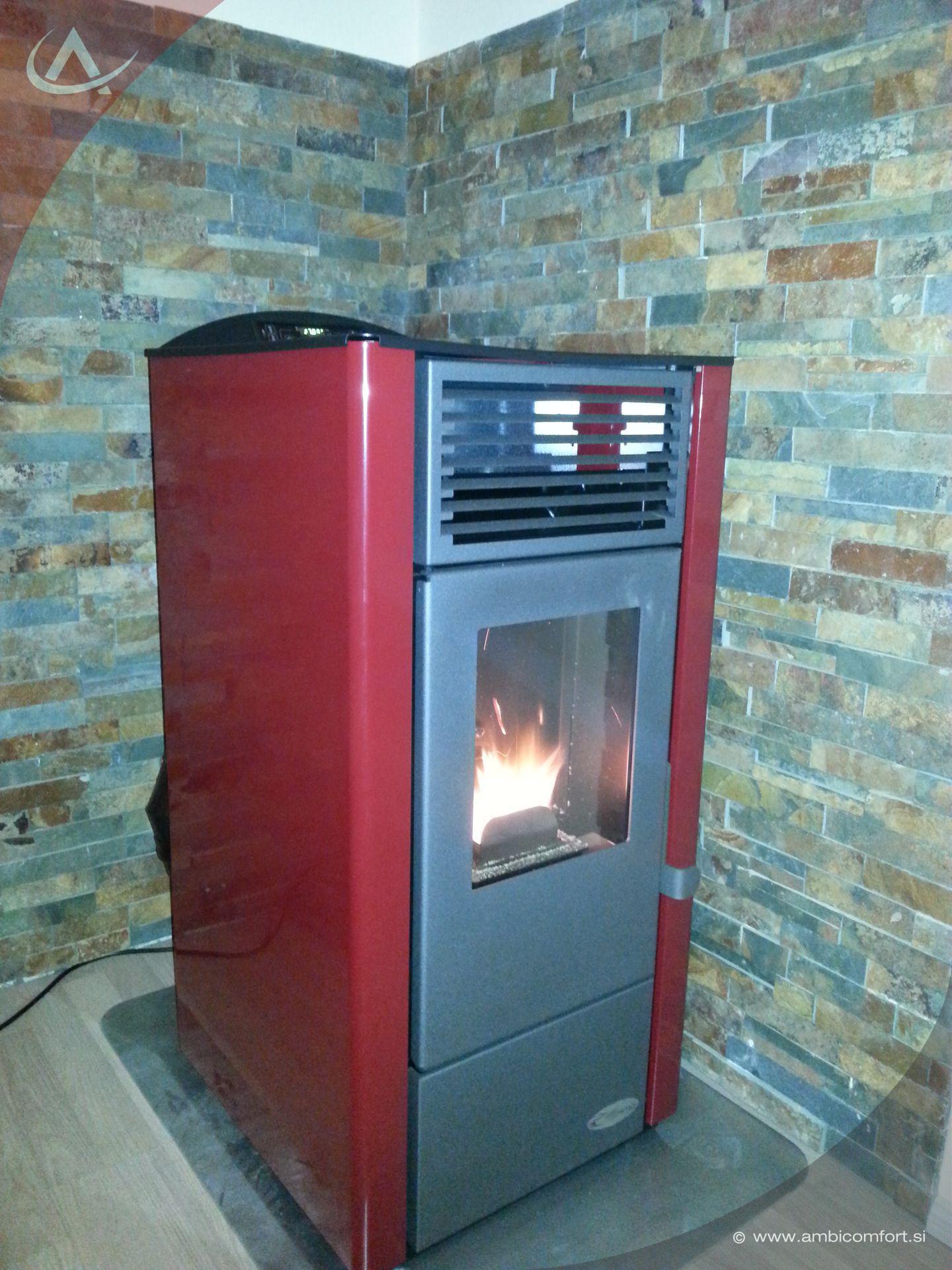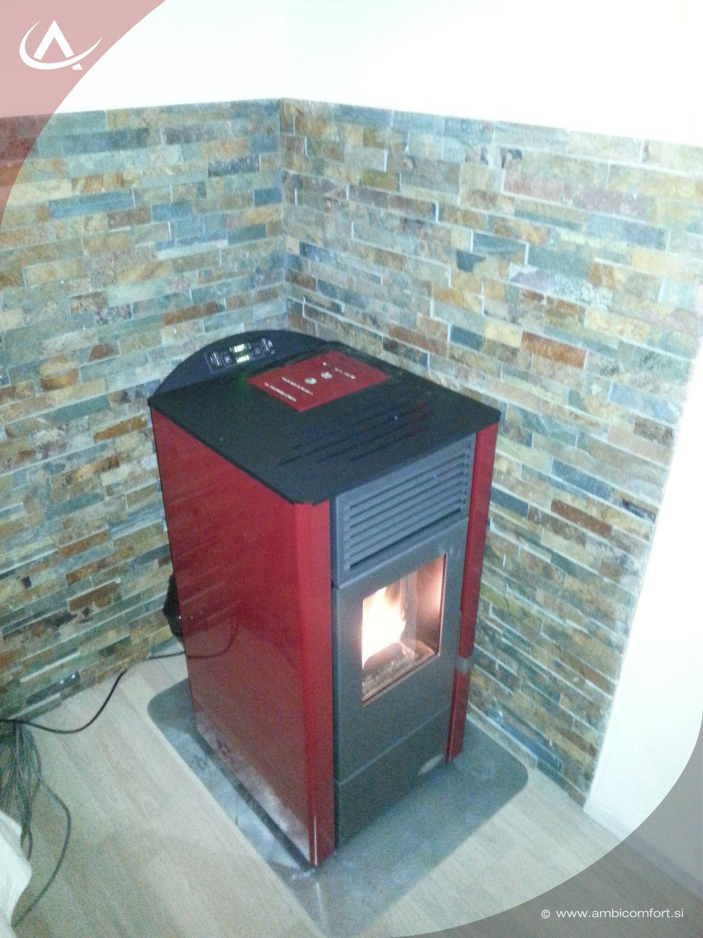 Za ogrevanja stanovanja je bila izbrana peč na pelete Lory. Rdeča barva obloge se odlično prileže zidni kamnitni prevleki.