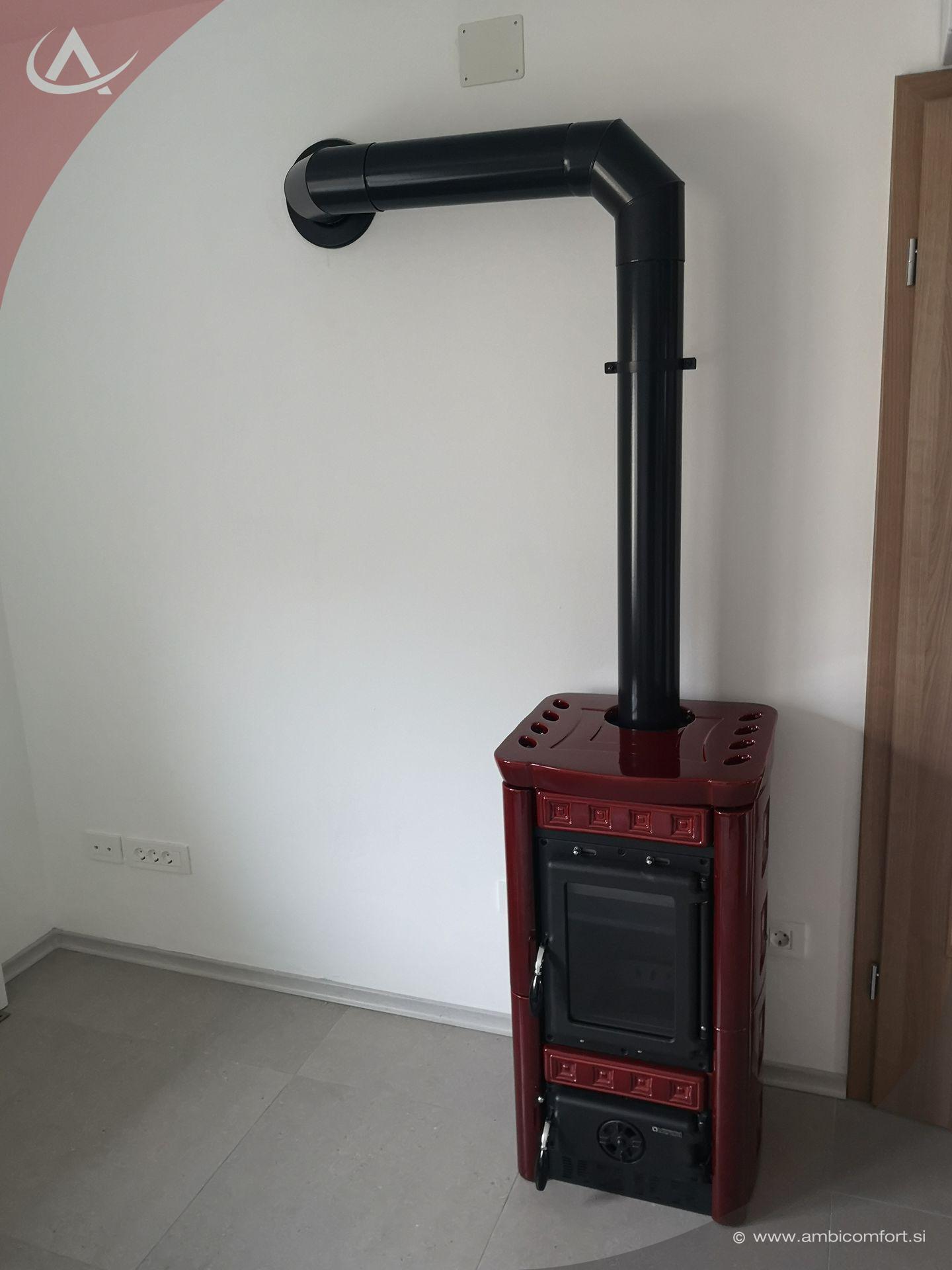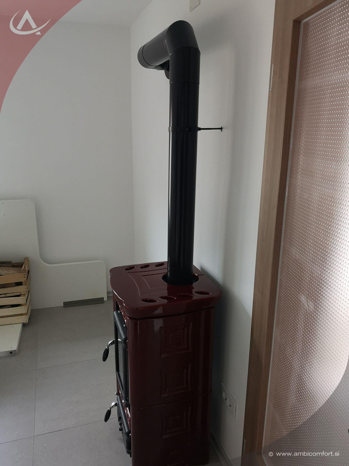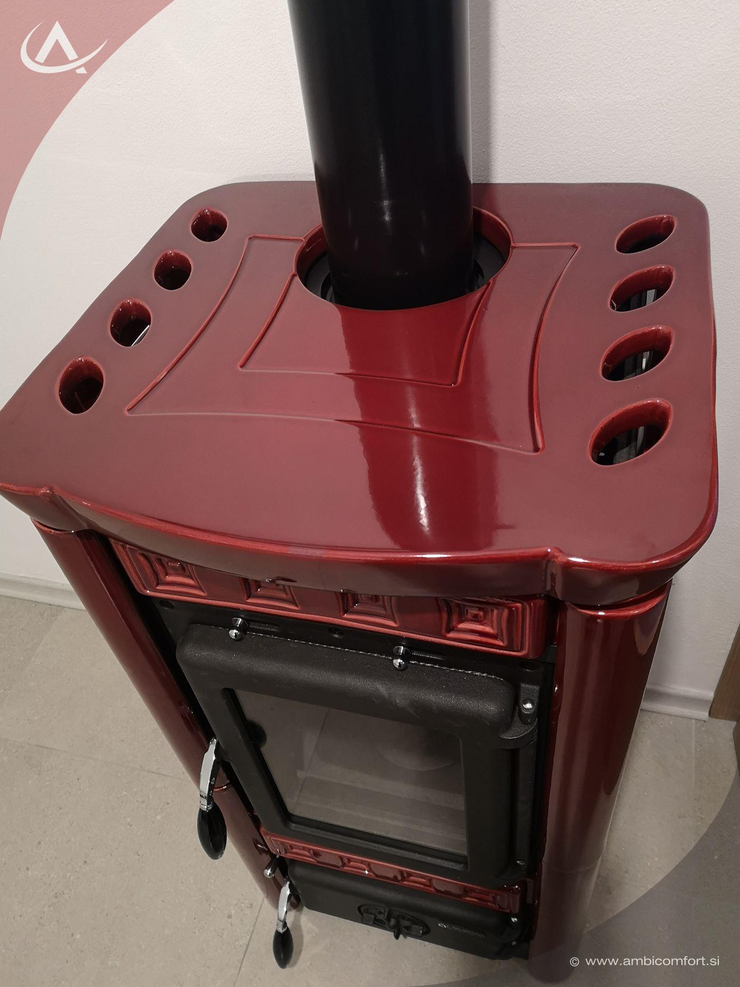 Ta visoko zmogljiva peč ima prefinjeno oblogo iz majolike z reliefnimi okraski.
