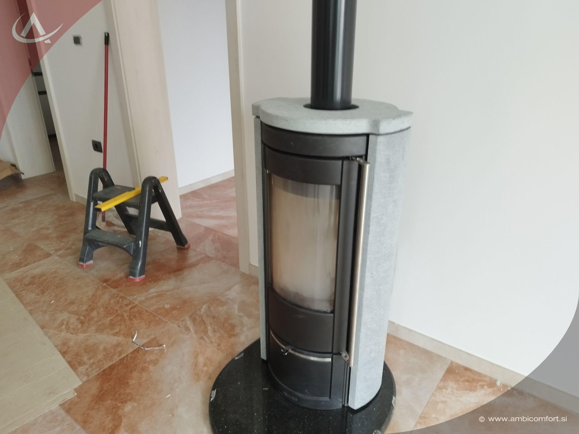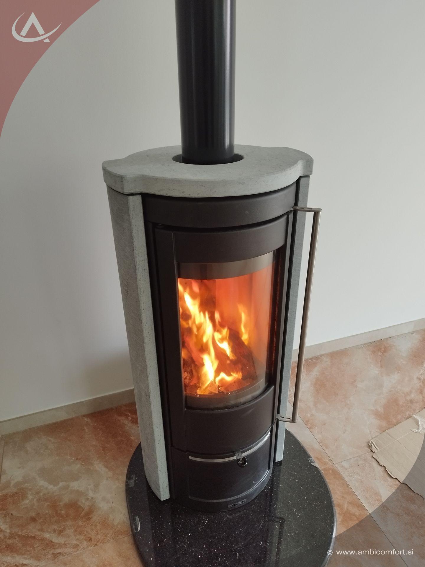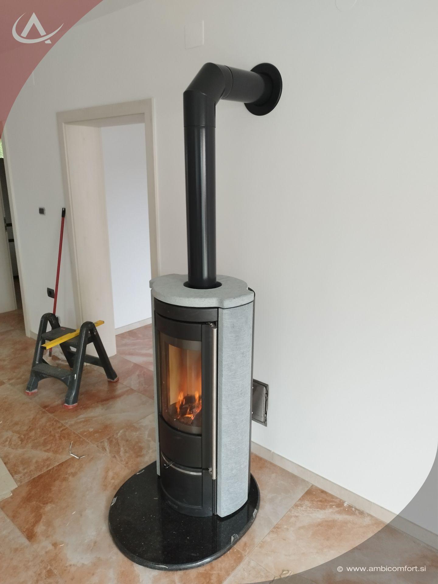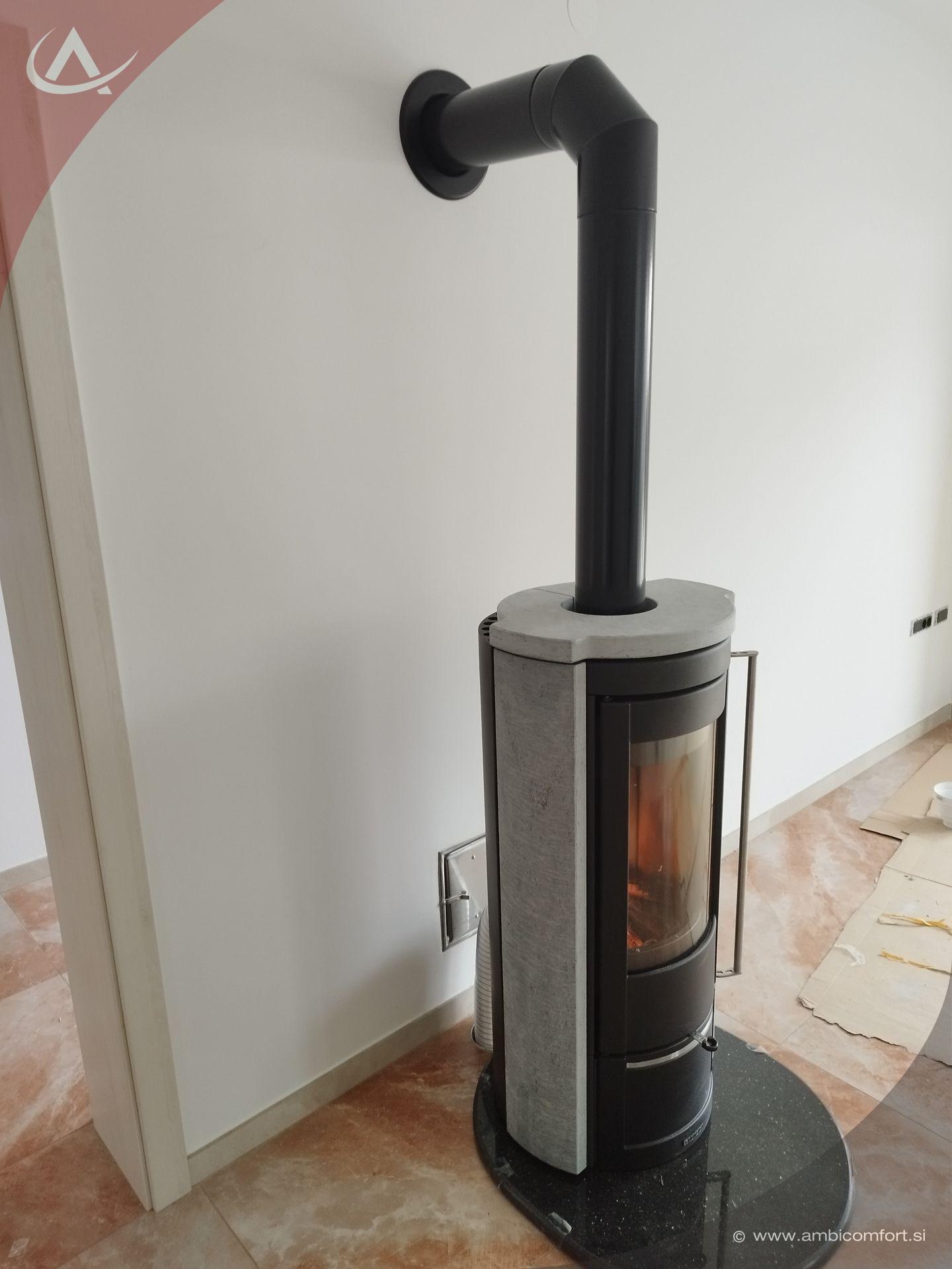Črne dimne emajlirane tenkostenske cevi Save dopolnjujejo eleganco peči. Pomembnost kaminske peči na drva je poudarjena z granitnim podstavkom, za katerega je gospodinja sama skrbno izbrala in pripravila.