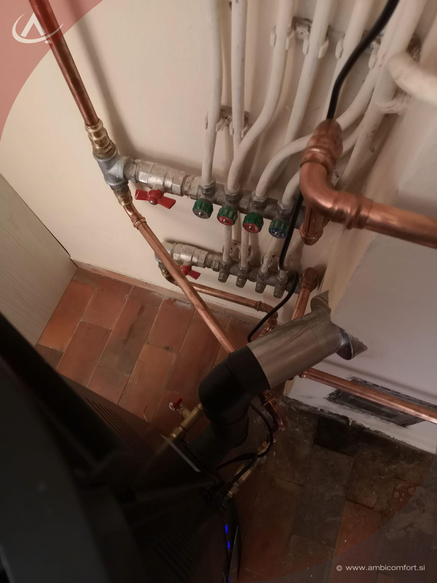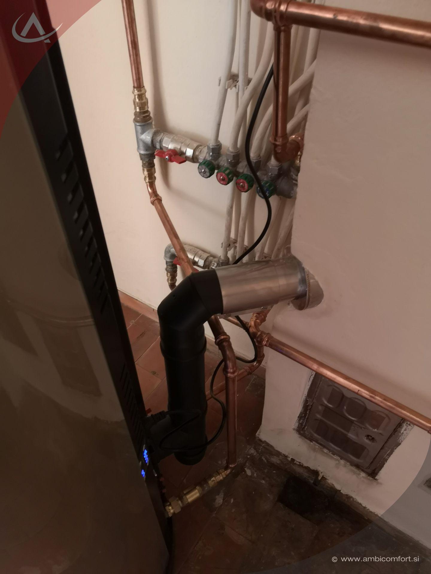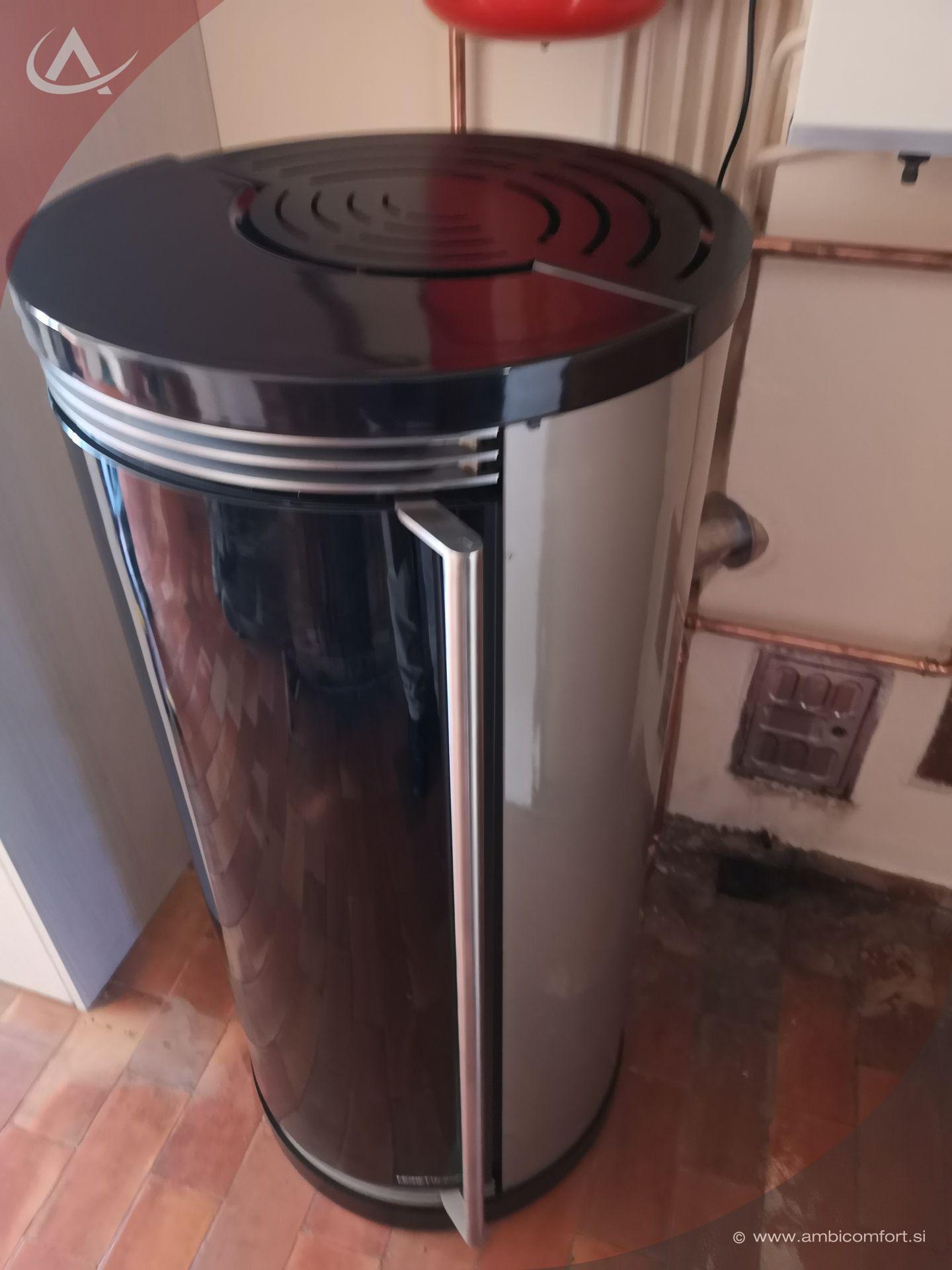 Termo kamin na pelete je lahko odlična rešitev takrat, ko ne razpolagamo s tehničnimi prostori, oziroma kurilnico. Zaradi lepega izgleda in direktnega ogrevanja prostora v katerem je kamin nameščen je instalacija lahko opravljena tudi v vhodu na stopnišču, kot je bilo izvedeno v tem primeru.