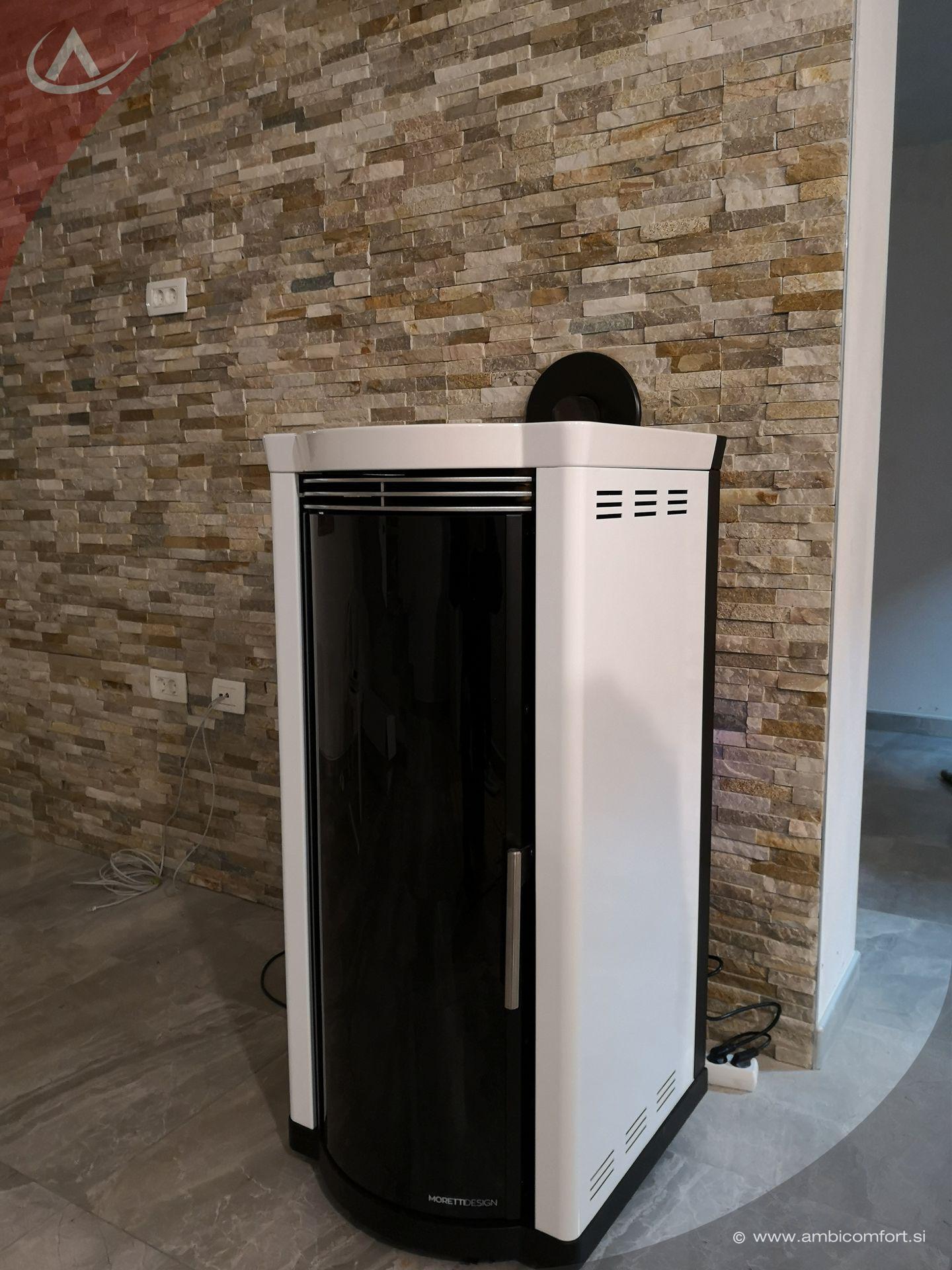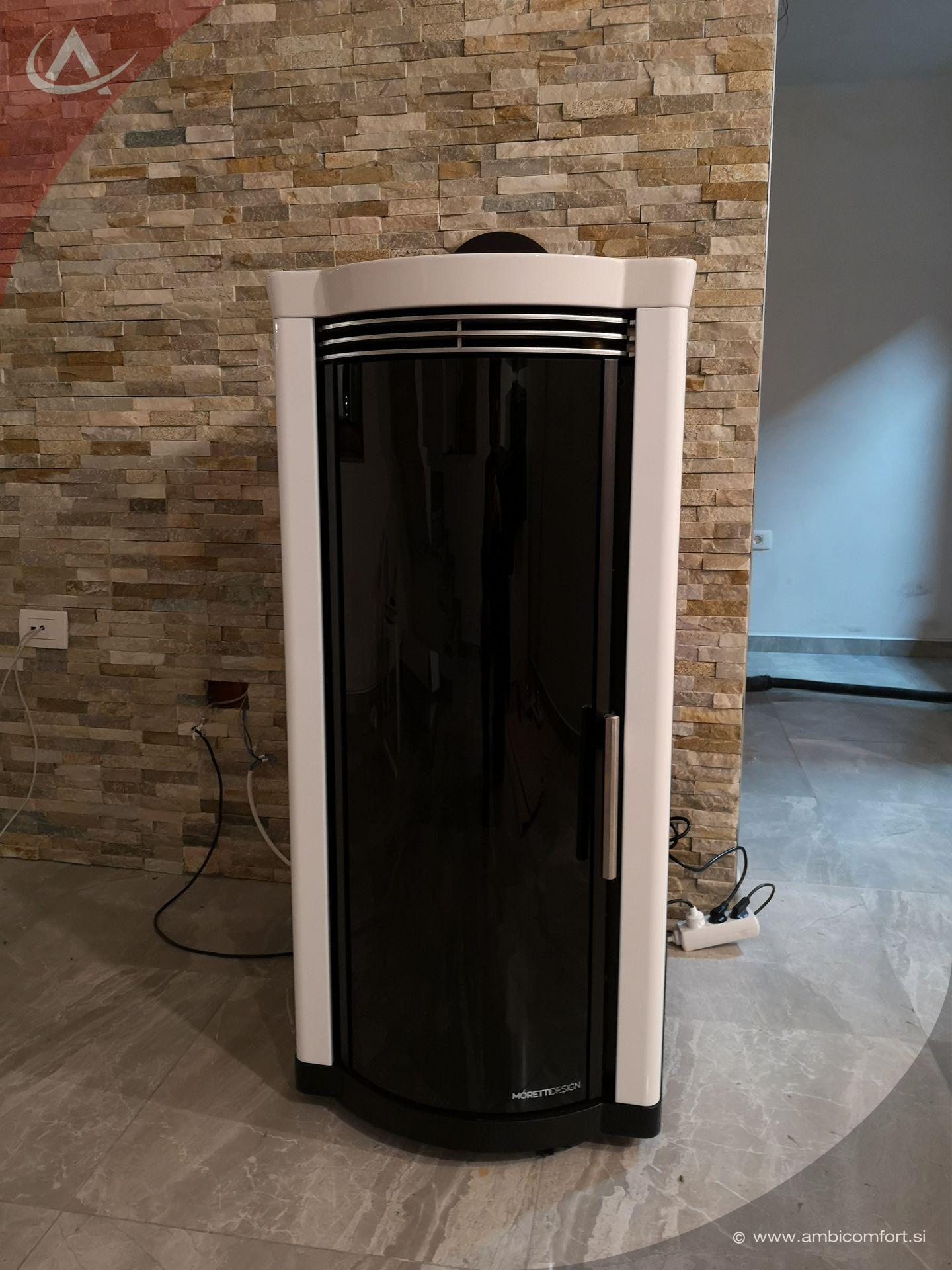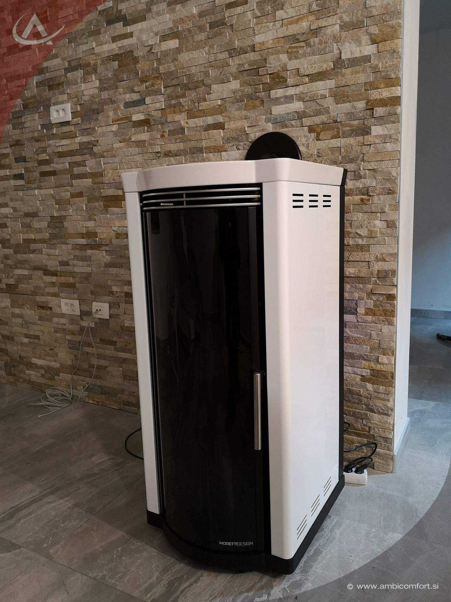 Kaminska peč na pelete Moretti Design Elegance z jekleno pobarvano prevleko in elegantnim keramičnim pokrovom. Velika vrata kurišča z dvojnim steklom, od katerih zunanje je obogateno s tehnologija Magic Glass. Ta tehnologija omogoča, da je steklo zatemnjeno takrat, ko ni ognja v kurišču. Peč postane del notranje opreme, ki dopolni in oplemeniti prostor tudi takrat, ko ni v uporabi.