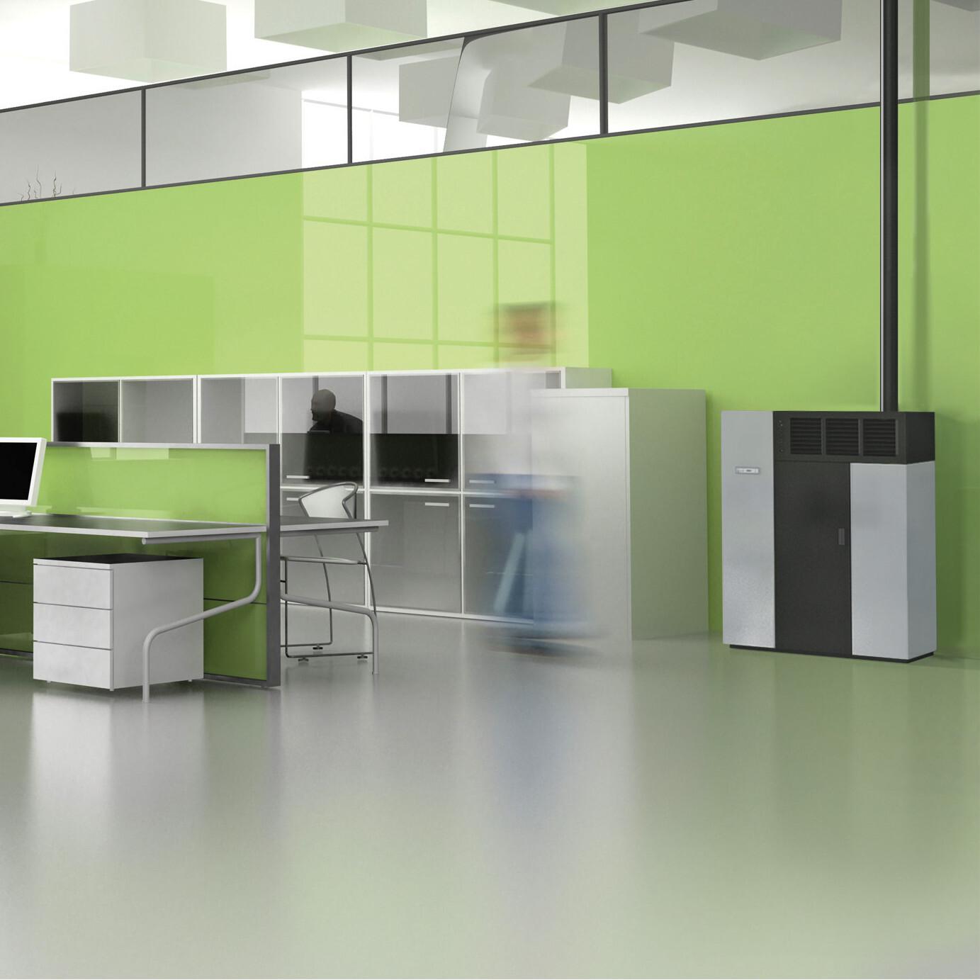 Compact pellet fired hot air generator with front air outlet. Steel casing and double door with removable handle. 5 power levels managed by display in 6 languages. Safety thermostat and manostat with possibility of connection to external thermostat.