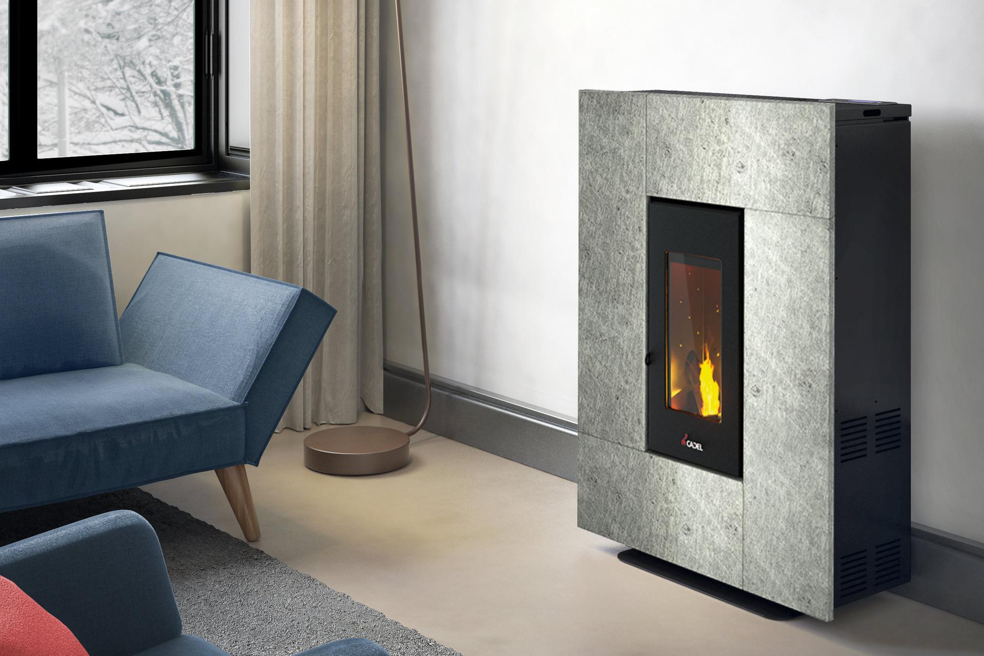 A pellet stove that decorates. The elegant and contemporary design of this stove makes it particularly suitable for small spaces, thanks to its depth of only 27.5 cm. Available as part of a practical kit for wall-to-wall installation. The front of the casing is made of natural stone serpentino.