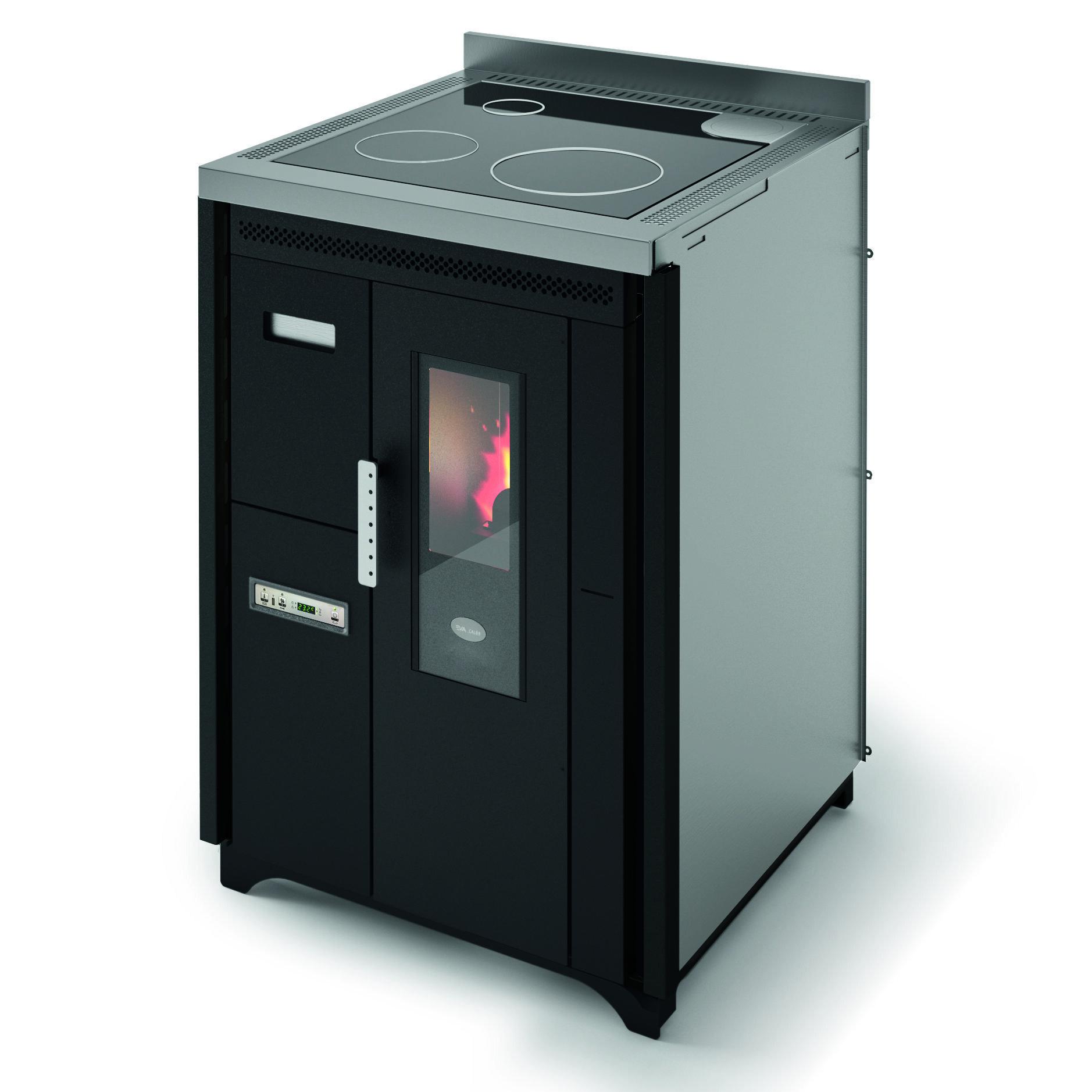 Vgradni štedilnik na pelete s steklokeramično kuhalno ploščo. Ventilator za distribucijo toplote je mogoče izklopiti, kadar ni potreben, npr. poleti. Premični sprednji predal za enostavno nalaganje peletov. 10 (5+5) stopenj moči je mogoče upravljati prek zaslona z menji, ki so na voljo v šestih jezikih. Varnostni termostat in manostat z možnostjo priključitve zunanjega termostata. Priključki za dimnik na zadnji in zgornji strani, kar omogoča boljše prilagajanje zahtevam namestitve.
