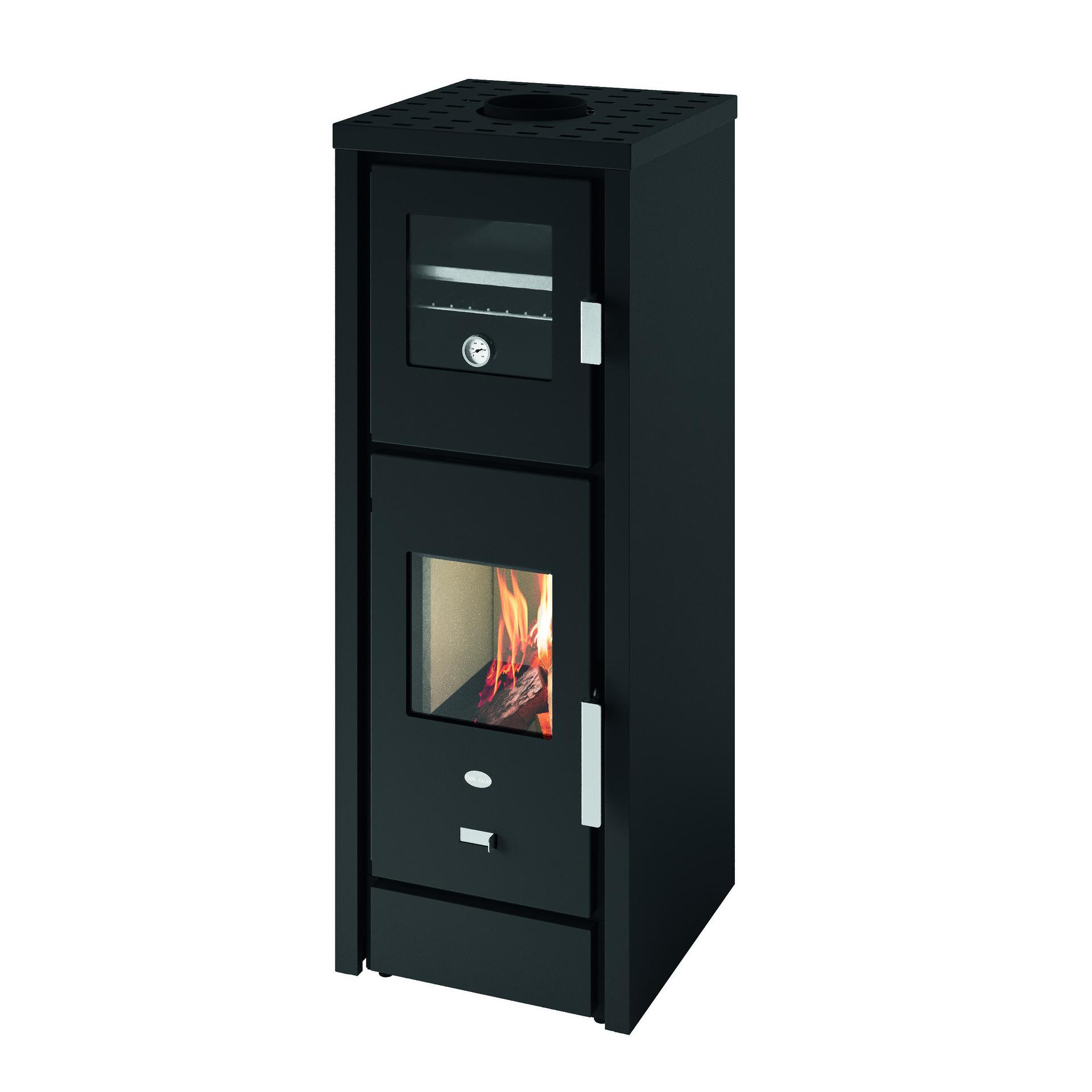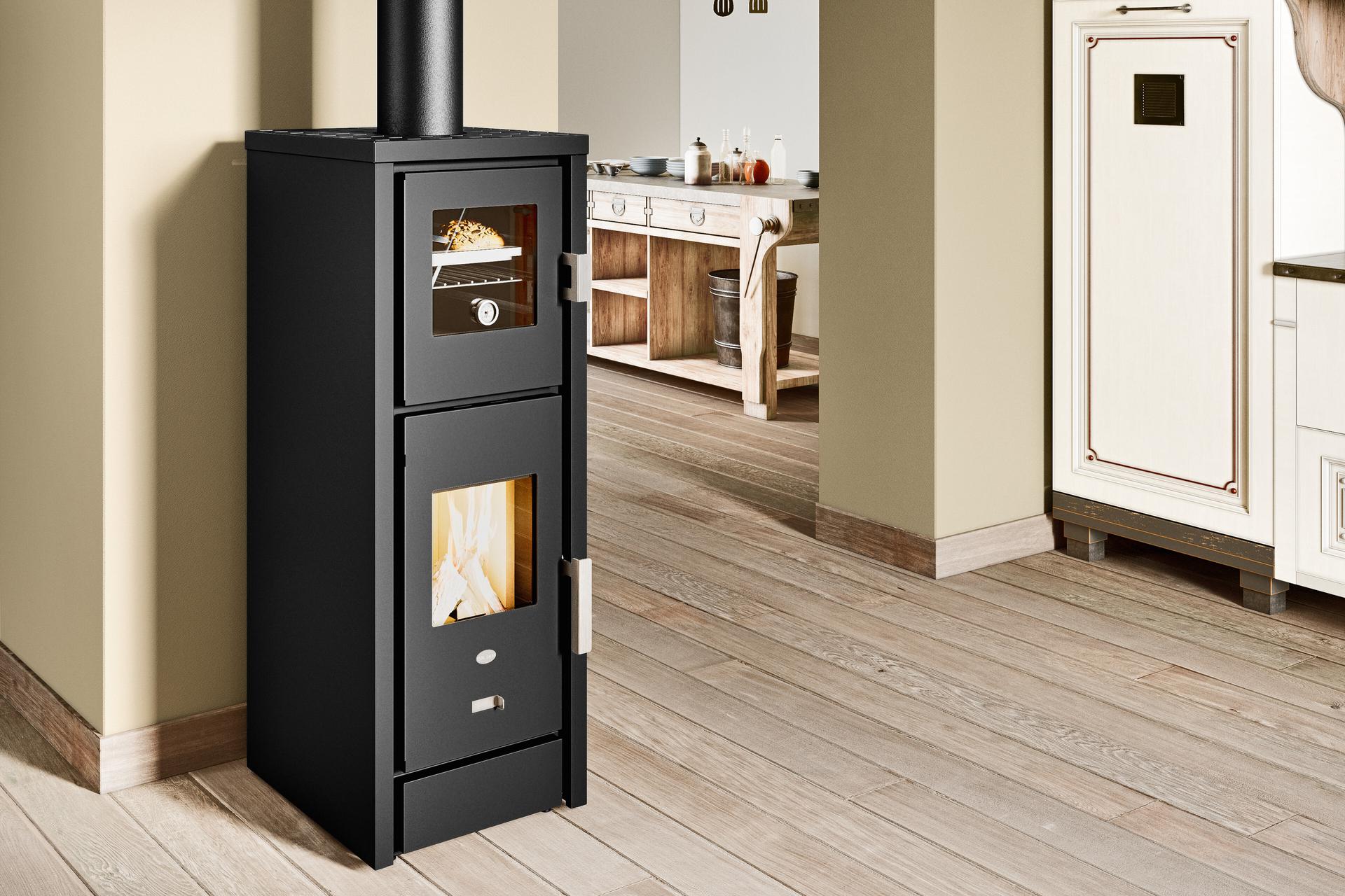 Peč na drva s pečico iz nerjavnega jekla, ki je opremljena z odstranljivimi vodili za držalo pladnja, aluminijastim pladnjem in držalom za pladenj.