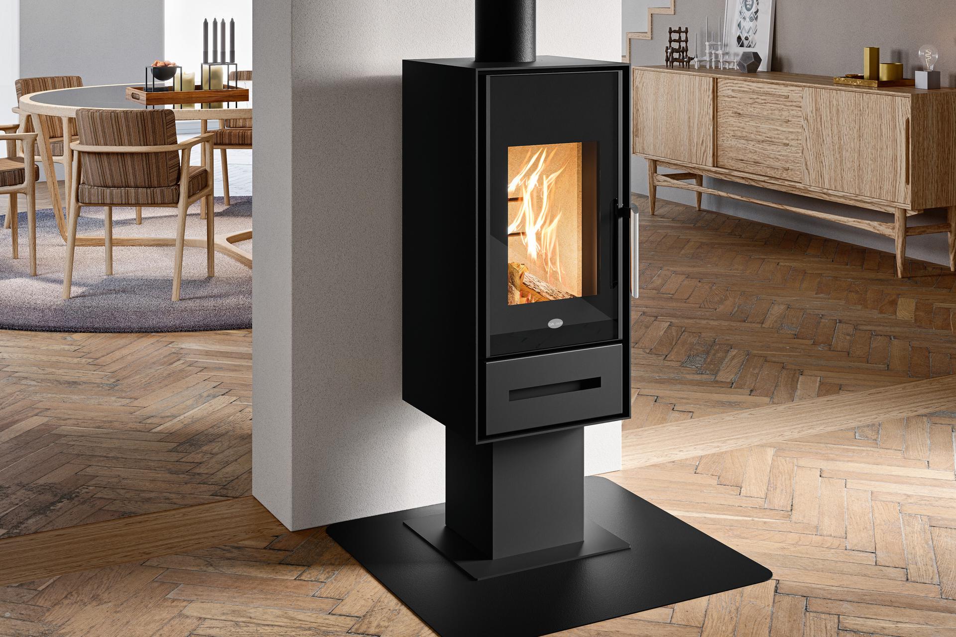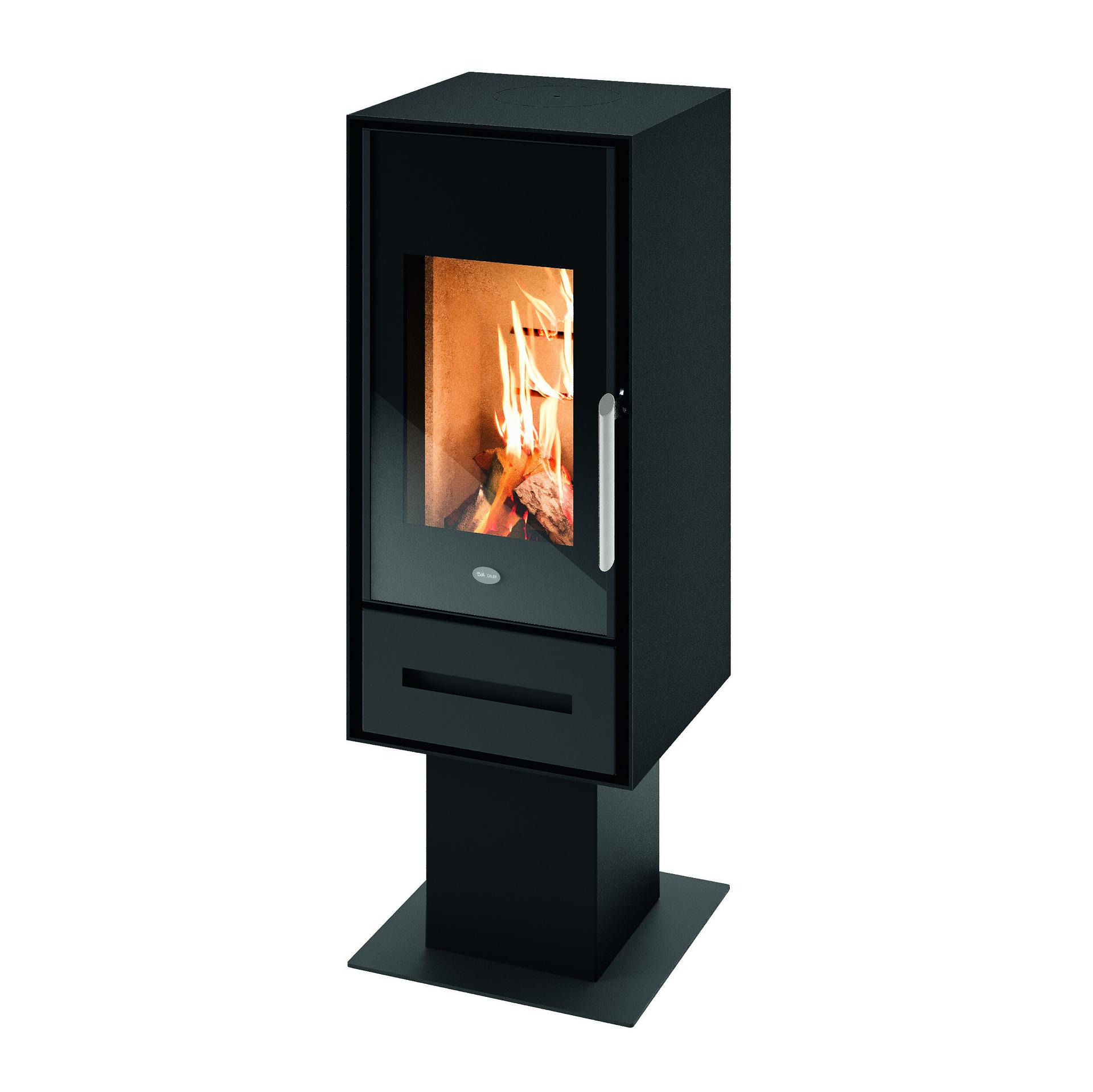 Sodobna, preprosta zasnova s črno sitotiskanim steklom, 5 mm debelo ploščo in elegantnim podstavkom. Zatesnjena peč z zgorevalno komoro iz vermikulita in regulacijo dovoda zraka. Odstranljiv predal za pepel za zbiranje pepela v ločenem predelu. Priključek za dimnik na zgornji in zadnji strani.
