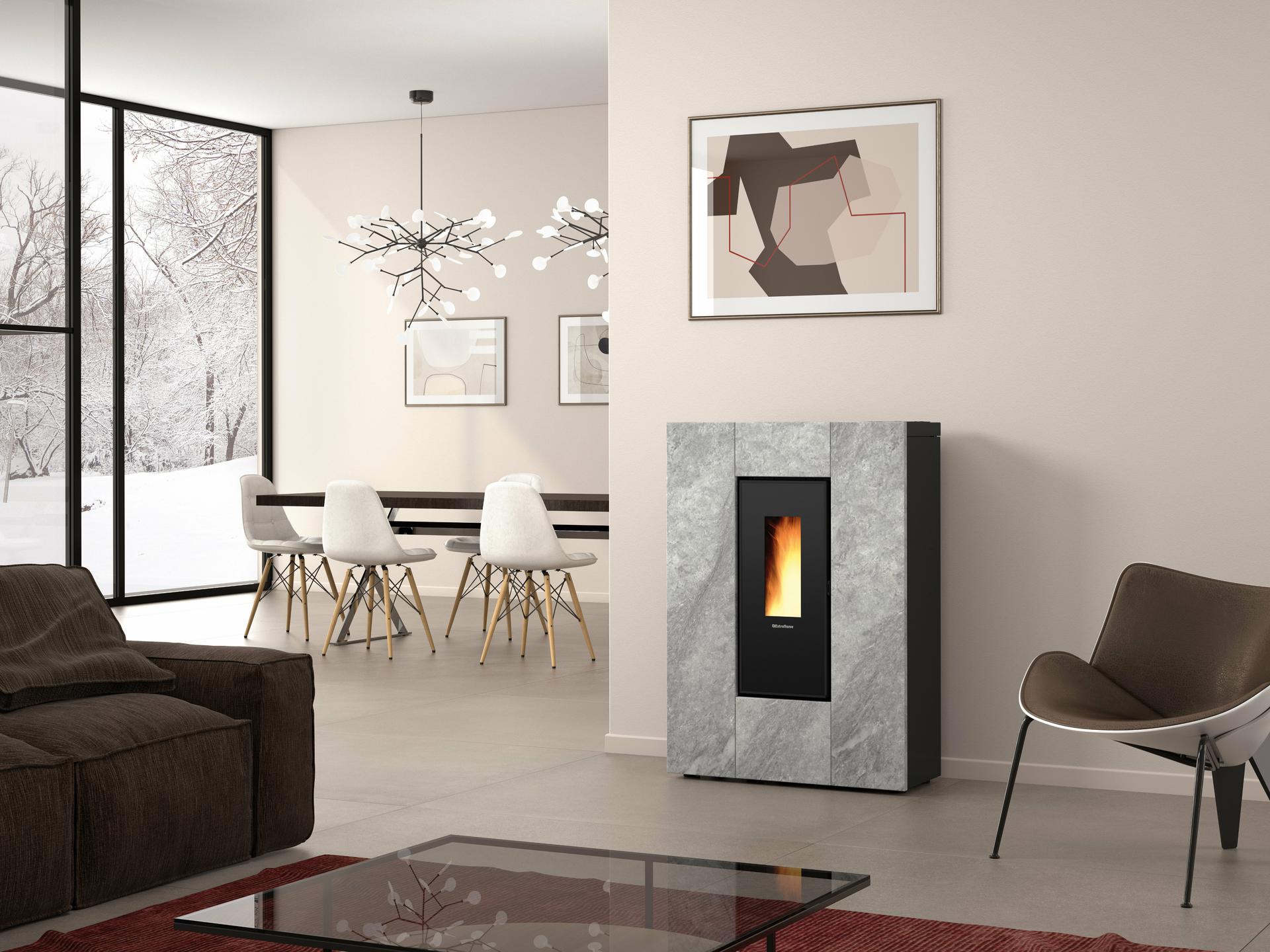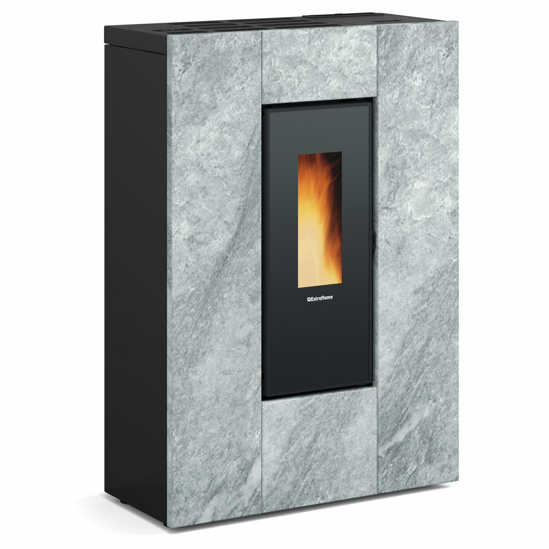 Kompaktna peč na pelete z oblogo iz naravnega kamna. Kanalski sistem z namenskim motorjem do 8 m, z možnostjo nastavitve termostata in izključitve. Kurišče, vrata kurišča in posoda kurišča iz litega železa.