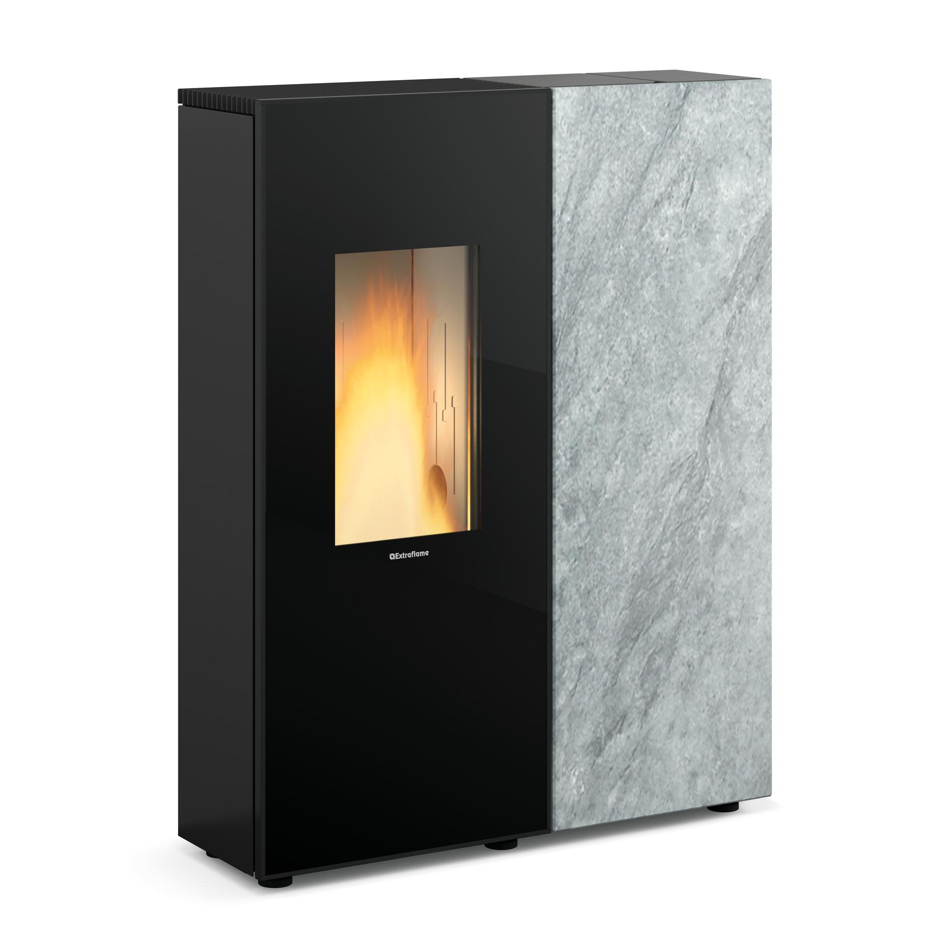 Hermetična peč na pelete s sodobno linearno zasnovo in dvojnimi vrati, pri čemer so zunanja vrata opremljena s keramičnim steklom. Zaradi uporabe naravnega kamna na sprednji ploskvi je ta izdelek lahko pomemben element opreme vašega prostora, kateremu dodaja eleganco. Možnost priključitve dimnika zadaj ali na zgornjem delu olajša namestitev peči.