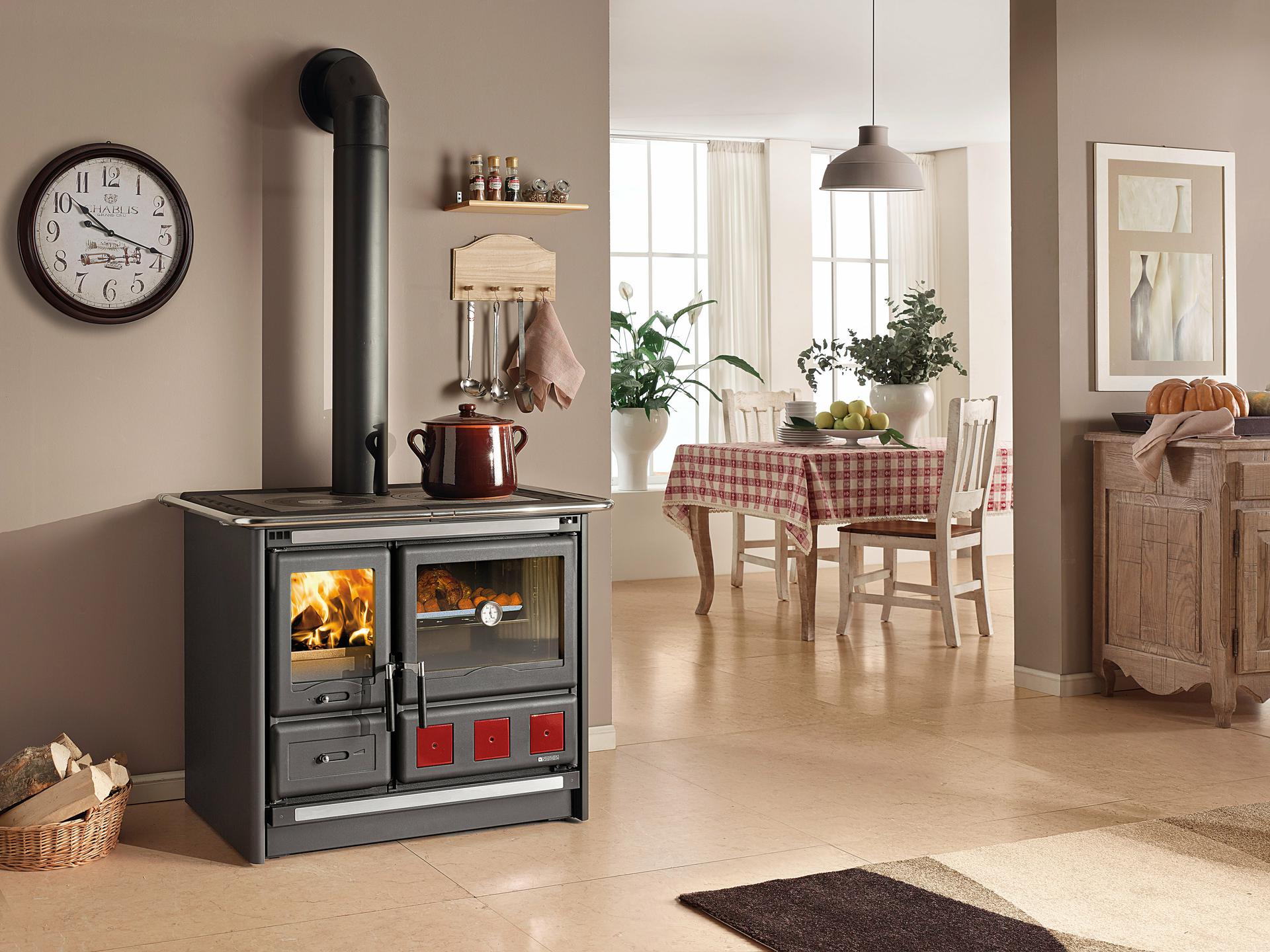 Tradicionalni štedilnik na drva s kuhalno ploščo in obroči iz poliranega litega železa. Notranja obloga kurišča iz litega železa in ognjevzdržnega materiala. Izvlečni predal za drva. Vrata kurišča iz litega železa z dvojnim steklom. Serijsko priložen komplet 3 črnih ploščic 10x10 cm.