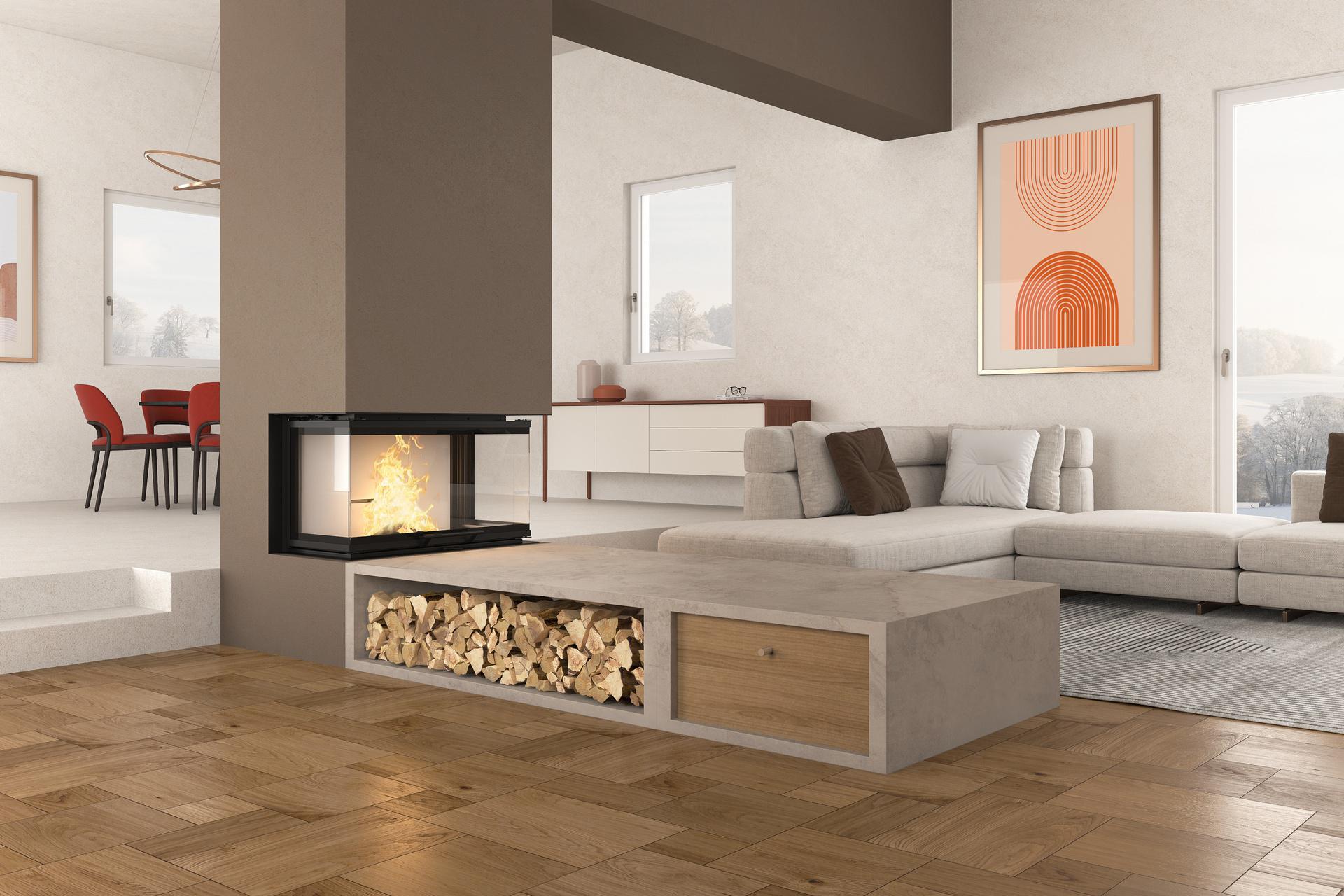 Monoblok na drva za kamine, za katerega je značilna robustnost zaradi uporabe močnih materialov. Posebnost je keramično steklo, razdeljeno na 3 dele, pri čemer se lahko kratke stranice odpirajo. Podstavek s kolesi in nastavljivo višino za enostavno postavitev. Zgorevalna komora z odstranljivo litoželezno rešetko, z izvlečnim predalom za pepel, je pregledna in obložena z zamenljivim Nordikerjem.