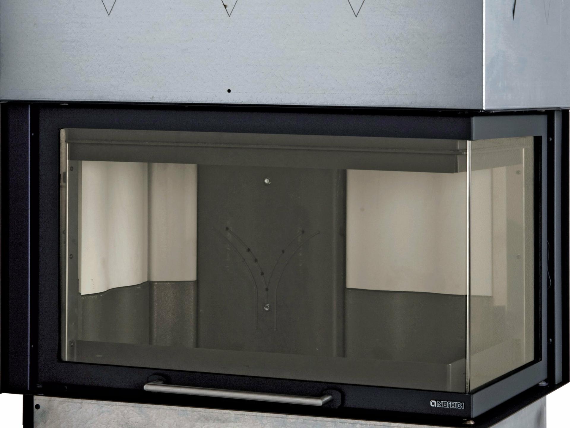 Kotni monoblok za kamine s kotnim keramičnim steklom v enem kosu. Dvižna drsna vrata na tihih teleskopskih drsnikih. Notranja obloga ognjišča iz litega železa in Nordikerja. Konstrukcija, kurišče in rešetka iz litega železa. Posebna jeklena kapa debeline 3 mm.