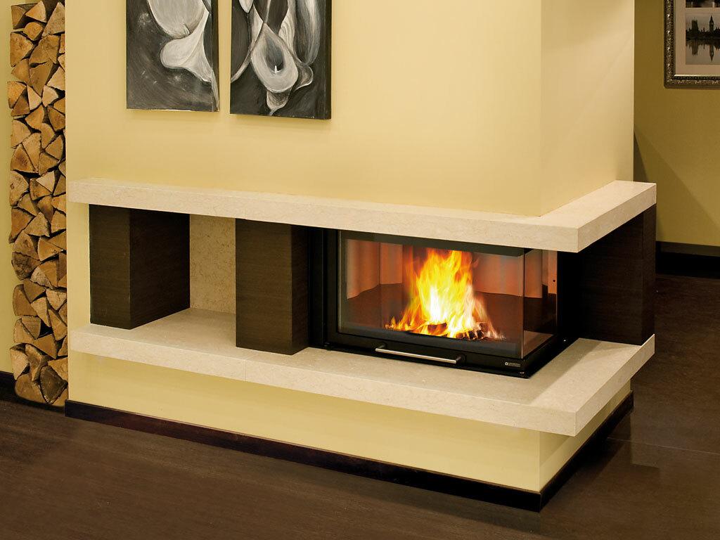 Kotni monoblok za kamine na drva z kotnim keramičnim steklom v enem kosu na desni strani.