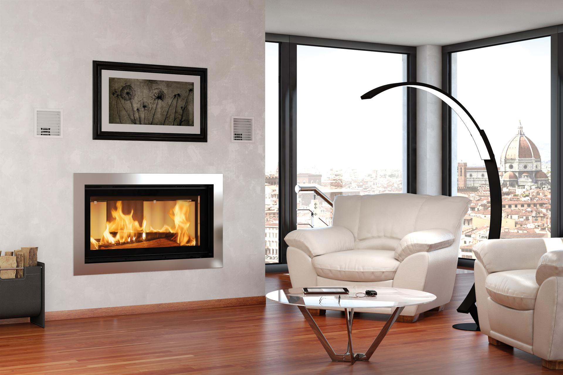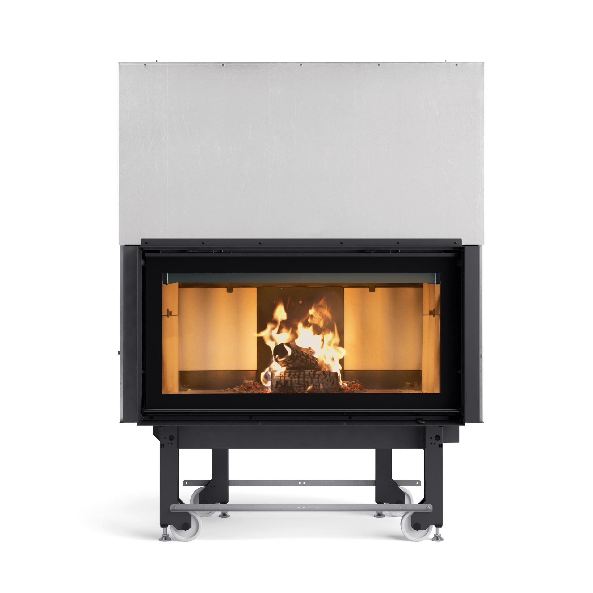 Monoblocco za kamine z odpiranjem vrat pod kotom 45° za notranje čiščenje keramičnega stekla. Obloga je iz nerjavnega jekla. Notranja obloga kamina je iz litega železa in Nordikerja.