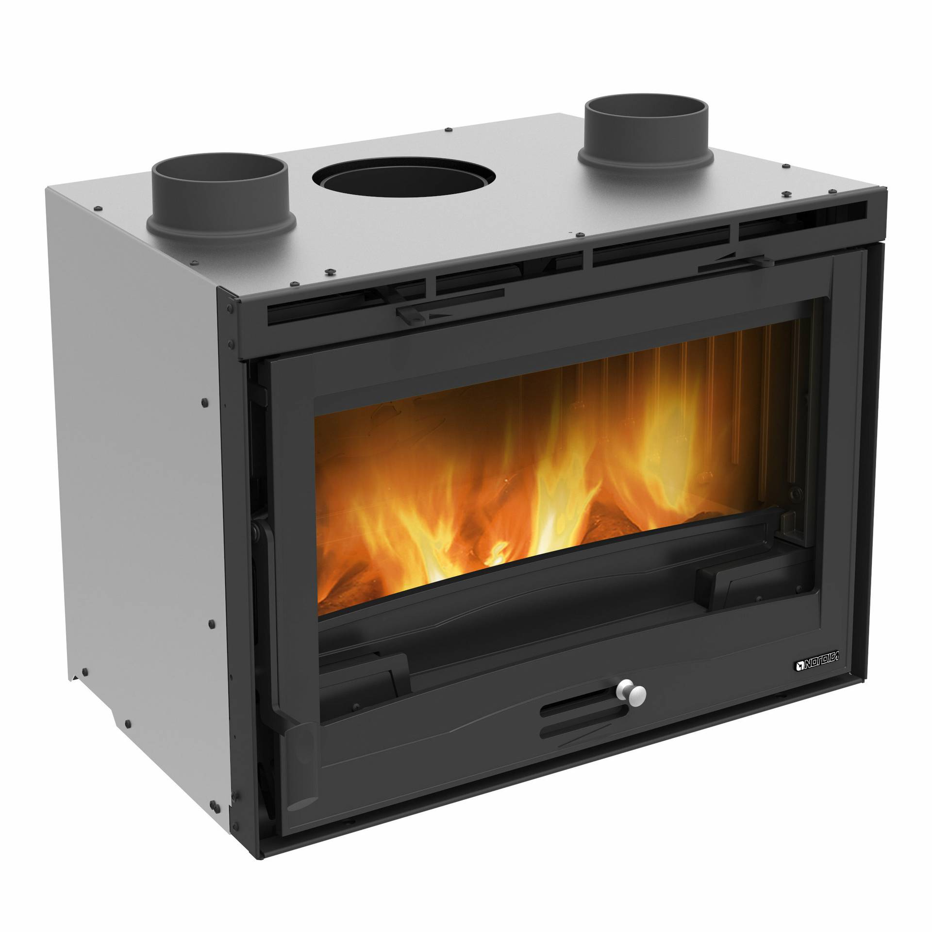 Ventilatorski vložek na drva z minimalno višino. Dva tangencialna ventilatorja za čelni vpih toplega zraka. Notranja obloga kurišča iz litega železa in Nordikerja. Vrata kurišča in konstrukcija iz litega železa. Keramično steklo. Nastavljiv primarni in sekundarni zrak za boljši nadzor zgorevanja s sistemom naknadnega zgorevanja za nizke emisije.