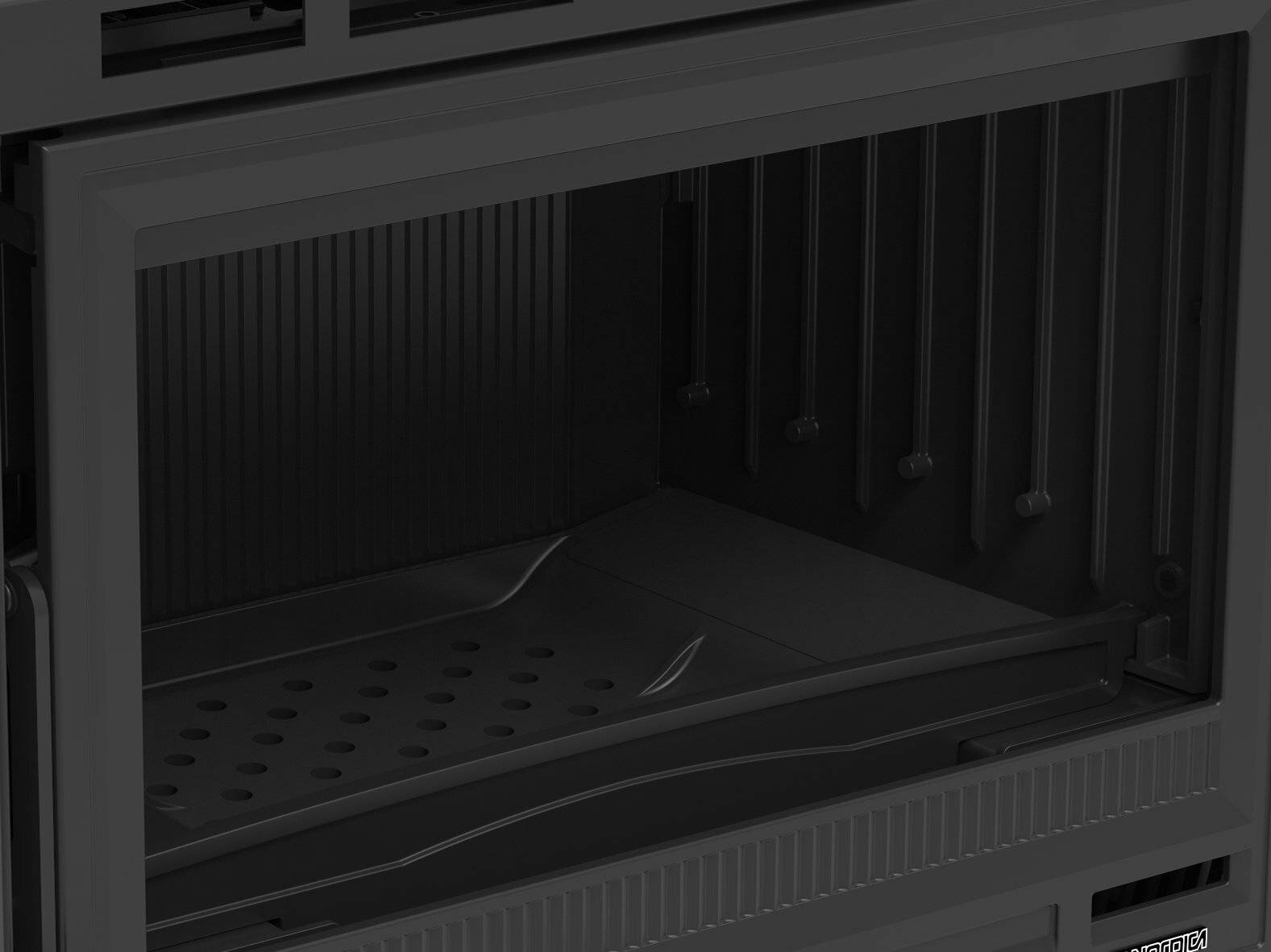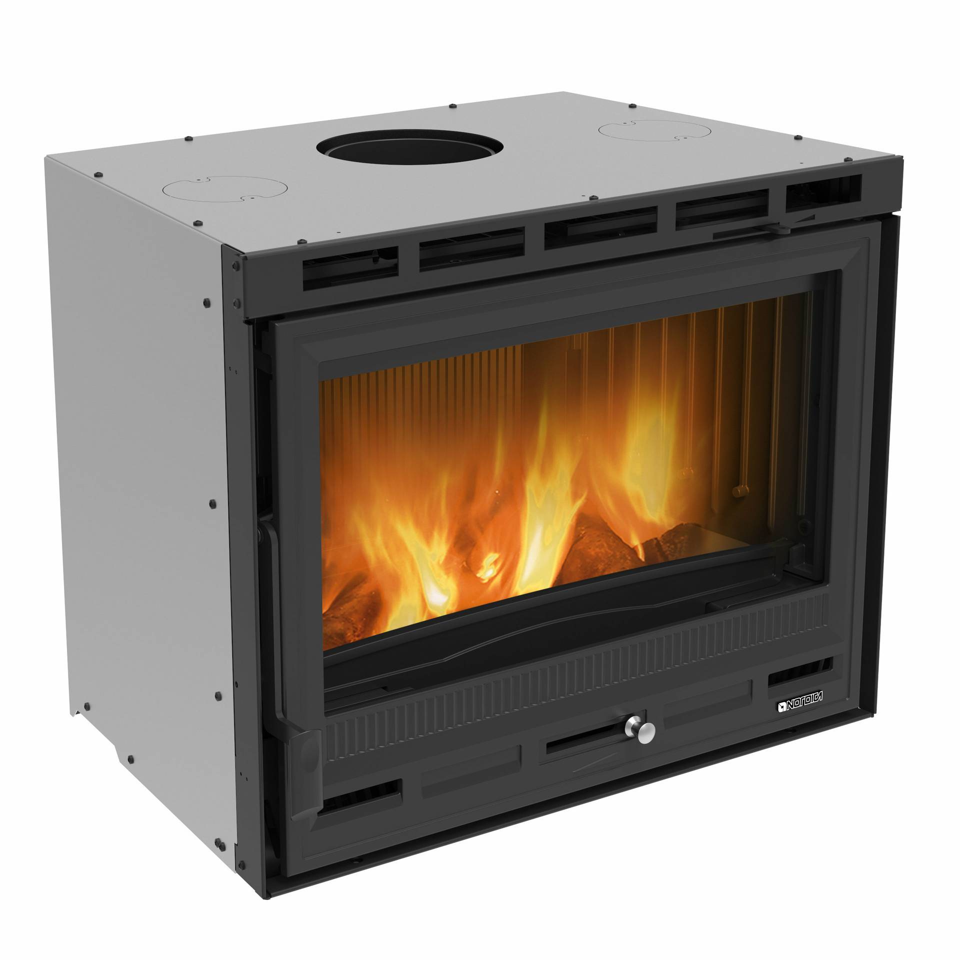 Vložek z ventilatorjem na drva z dvema tangencialnima ventilatorjema s čelnim vpihom. Notranja obloga kurišča iz litega železa. Vrata kurišča in konstrukcija iz litega železa. Keramično steklo. Nastavljiv primarni in sekundarni zrak za boljši nadzor zgorevanja s sistemom naknadnega zgorevanja za nizke emisije.