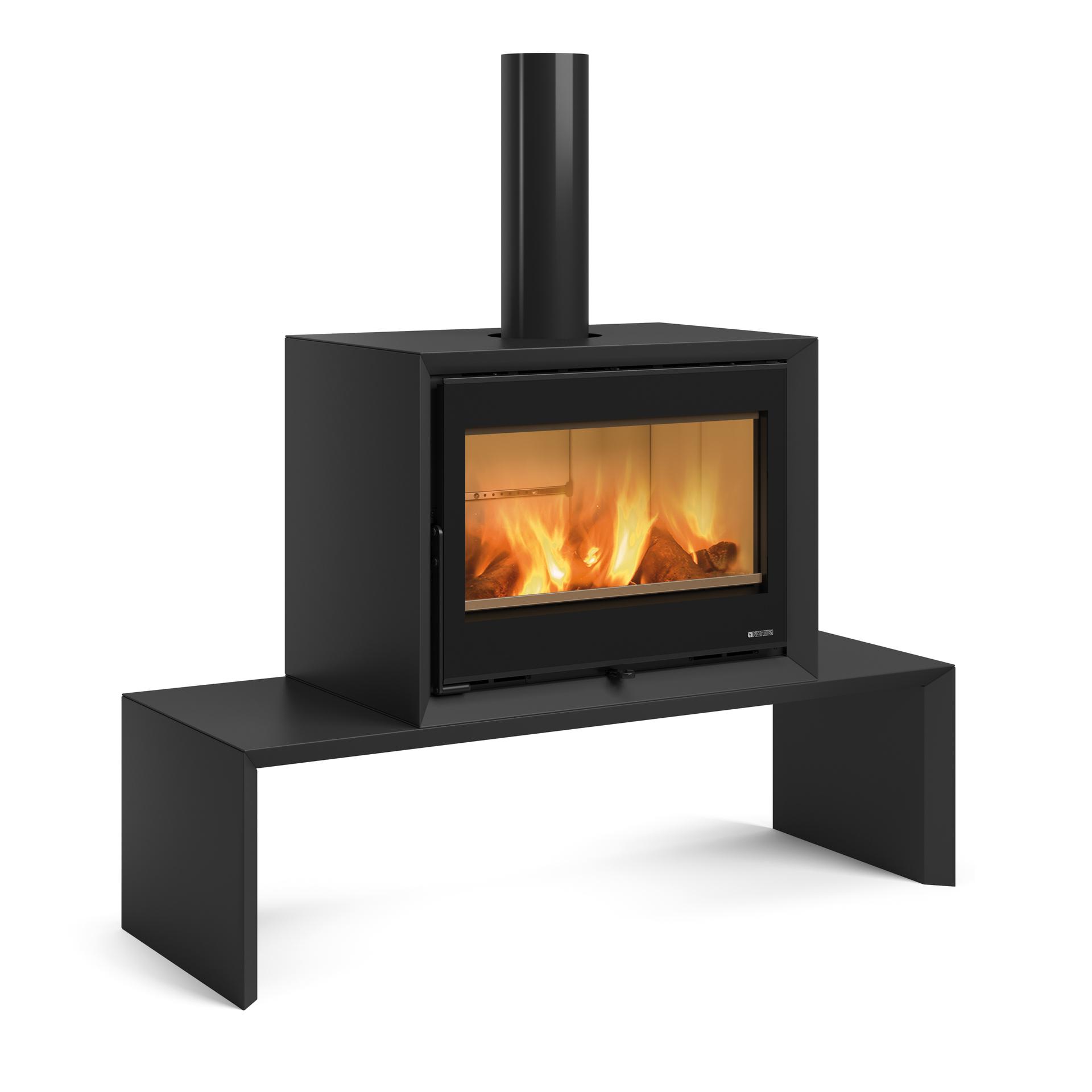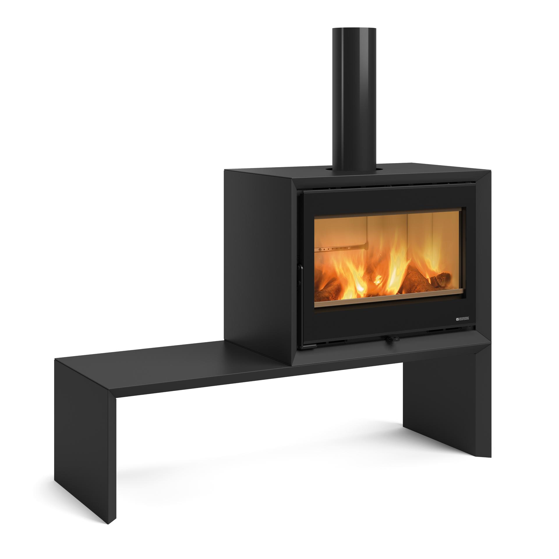 Peč na drva s sistemom za rekuperacijo toplote EPS in nizkim dnom kurišča za odlično vidljivost plamena. Vodoravna klop je na voljo kot opcija.