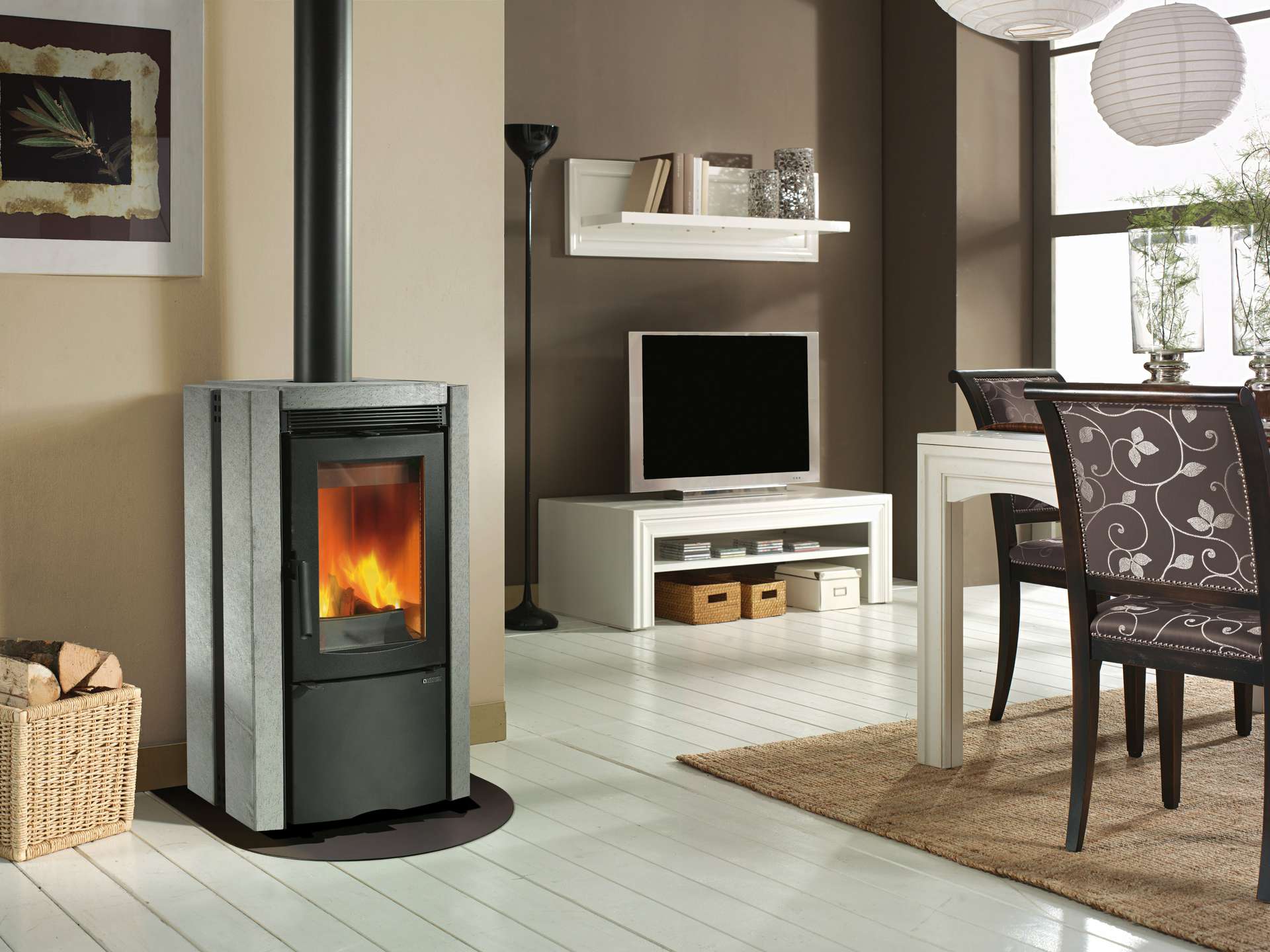Peč na drva z zunanjo oblogo iz naravnega kamna in pečico iz porcelanastega jekla. Vrata, zgornji del, podstavek in okvir iz emajlirane litine. Notranja obloga kurišča iz litega železa. Keramično steklo s širokim pogledom na plamen.