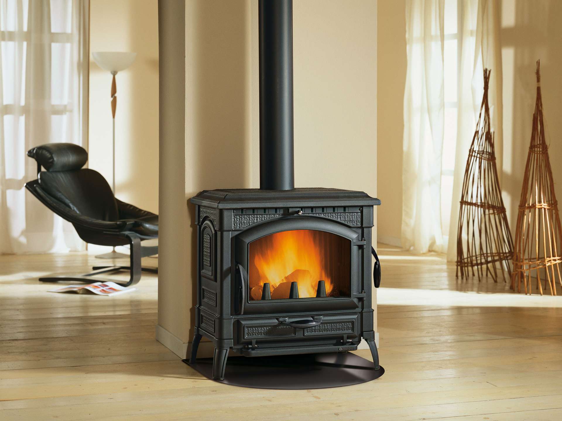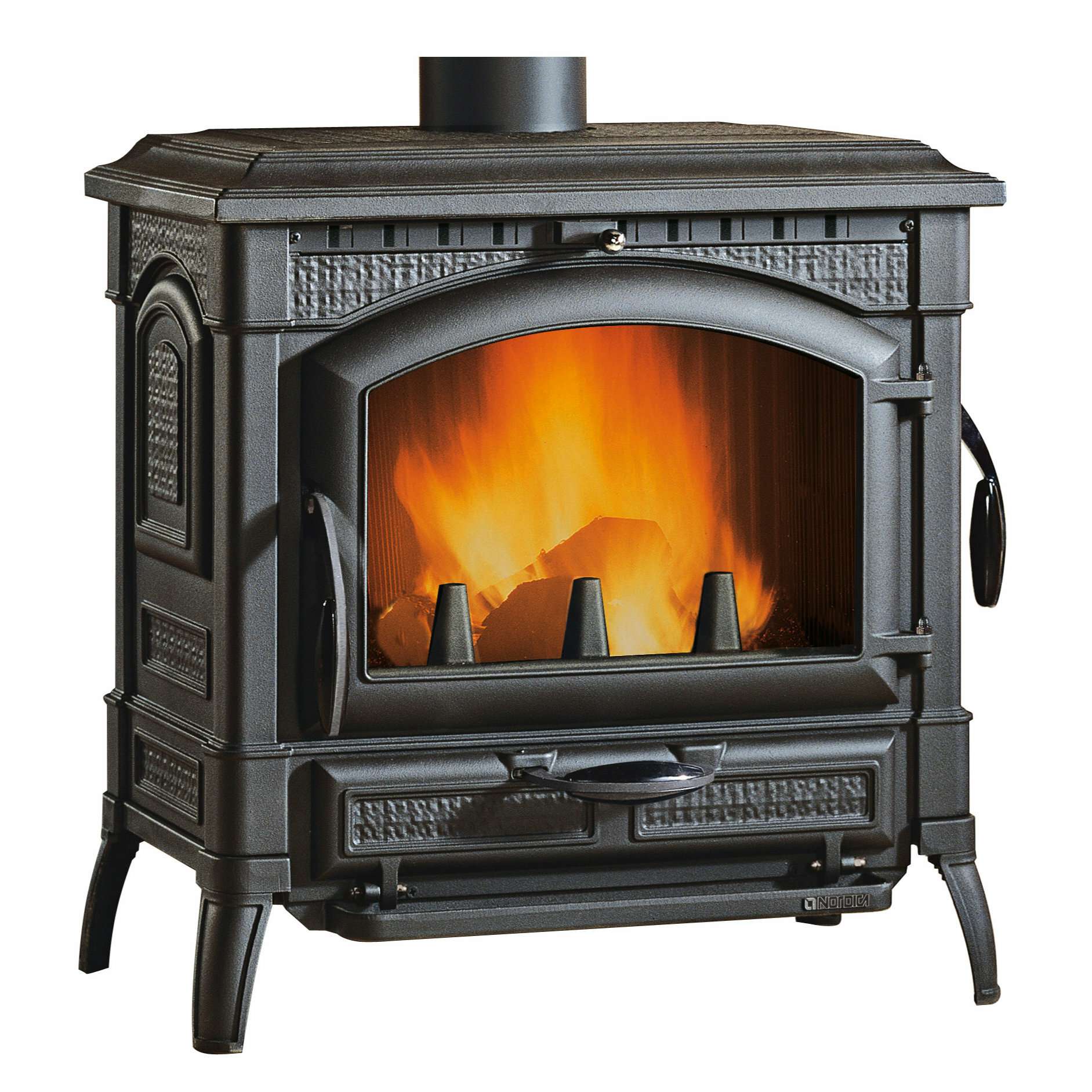 Peč na drva s strukturo iz emajliranega litega železa. Sprednja in stranska nakladalna vrata. Keramično steklo.