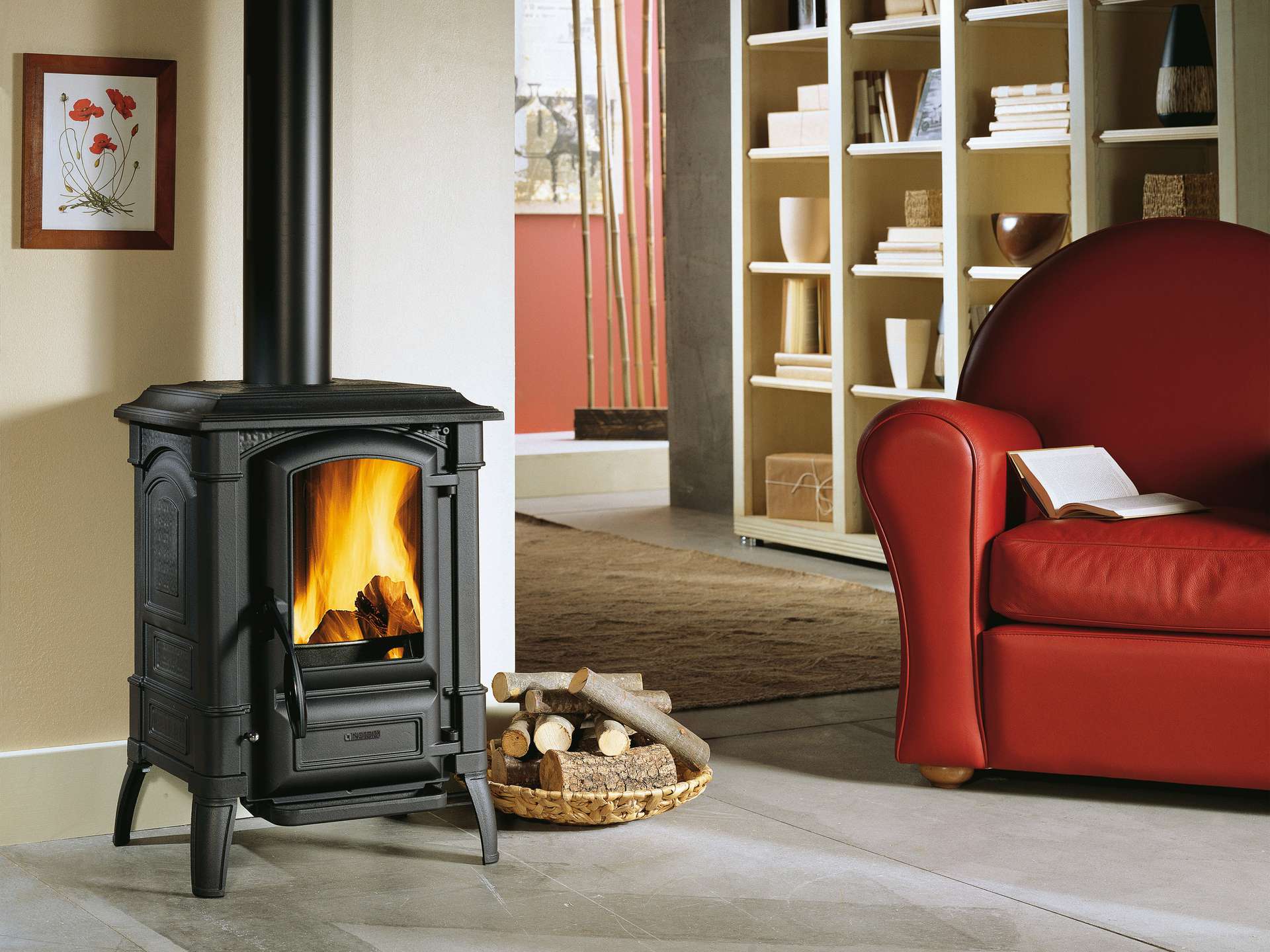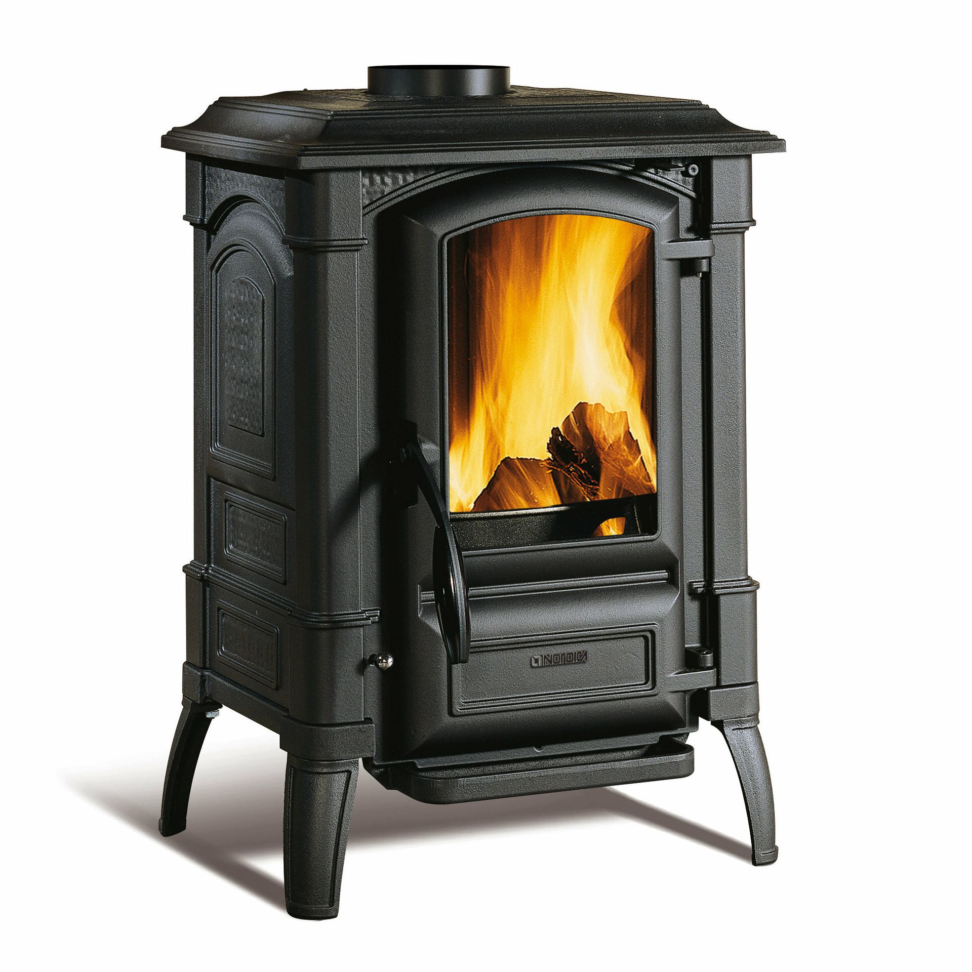 Peč na drva s konstrukcijo iz emajliranega litega železa. Rustikalna zasnova s kompaktnimi dimenzijami.