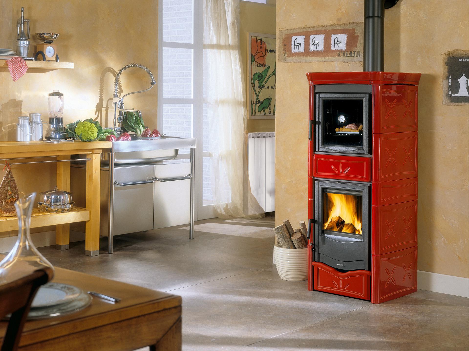 Termo peč na drva s pečico iz porcelanasto emajliranega jekla, varnostno napravo DSA (ventil DSA ni vključen) in ročno izdelano oblogo iz majolike. Notranja obloga kurišča iz litega železa in jekla. Emajlirana vrata iz litega železa s keramičnim steklom. Zračni termostatski ventil.