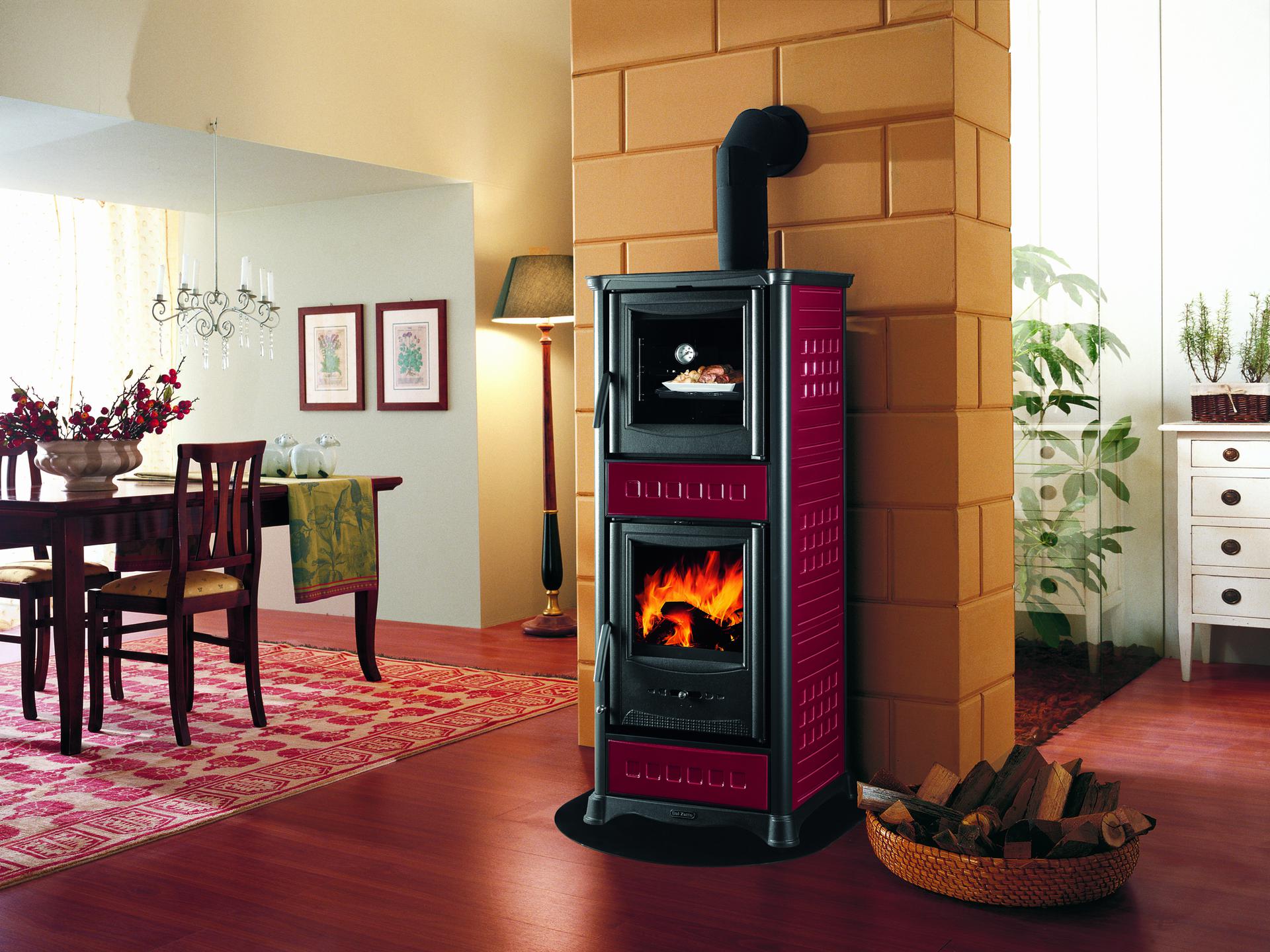 Peč na drva s pečico z oblogo iz majolike. Primarni in sekundarni zrak ter dvojno izgorevanje. Velik predal za drva. Zgornji del, podnožje in vrata iz emajliranega litega železa.