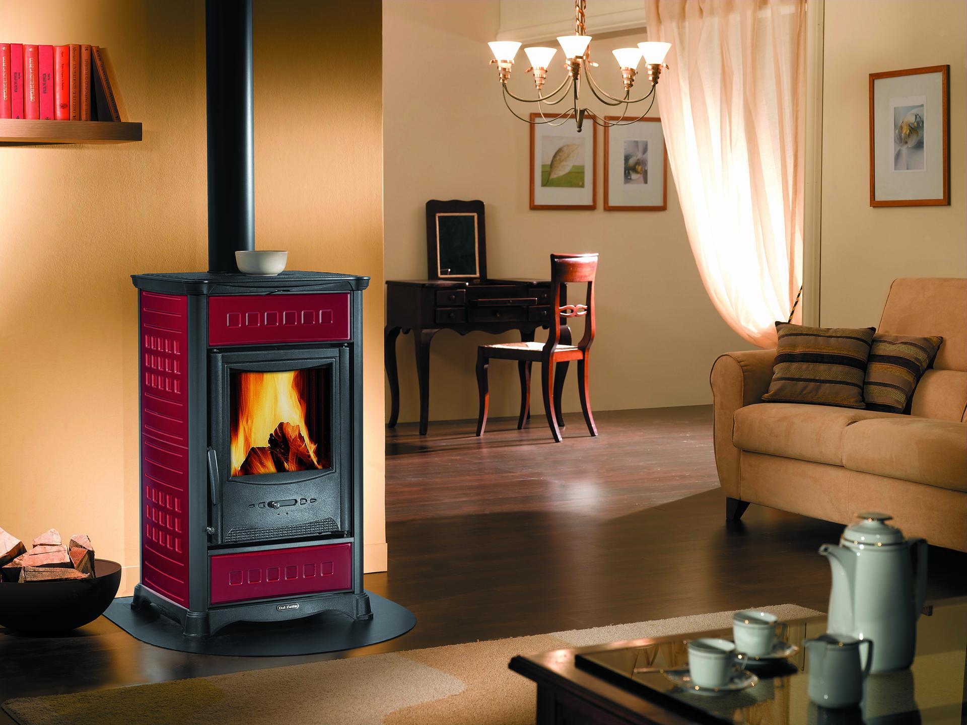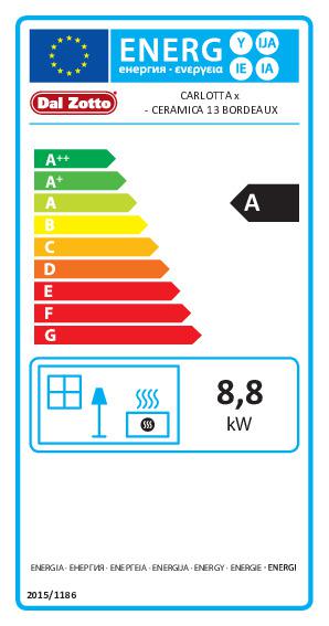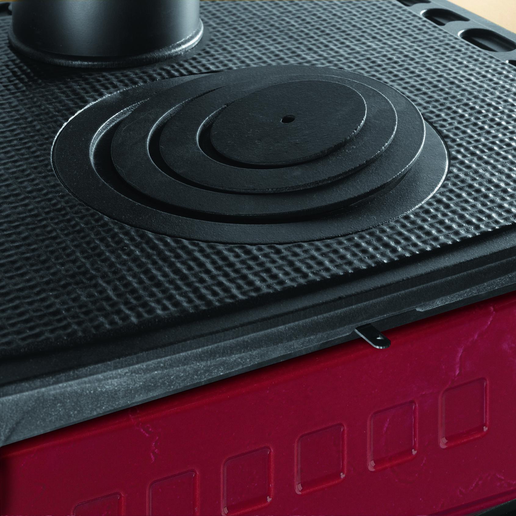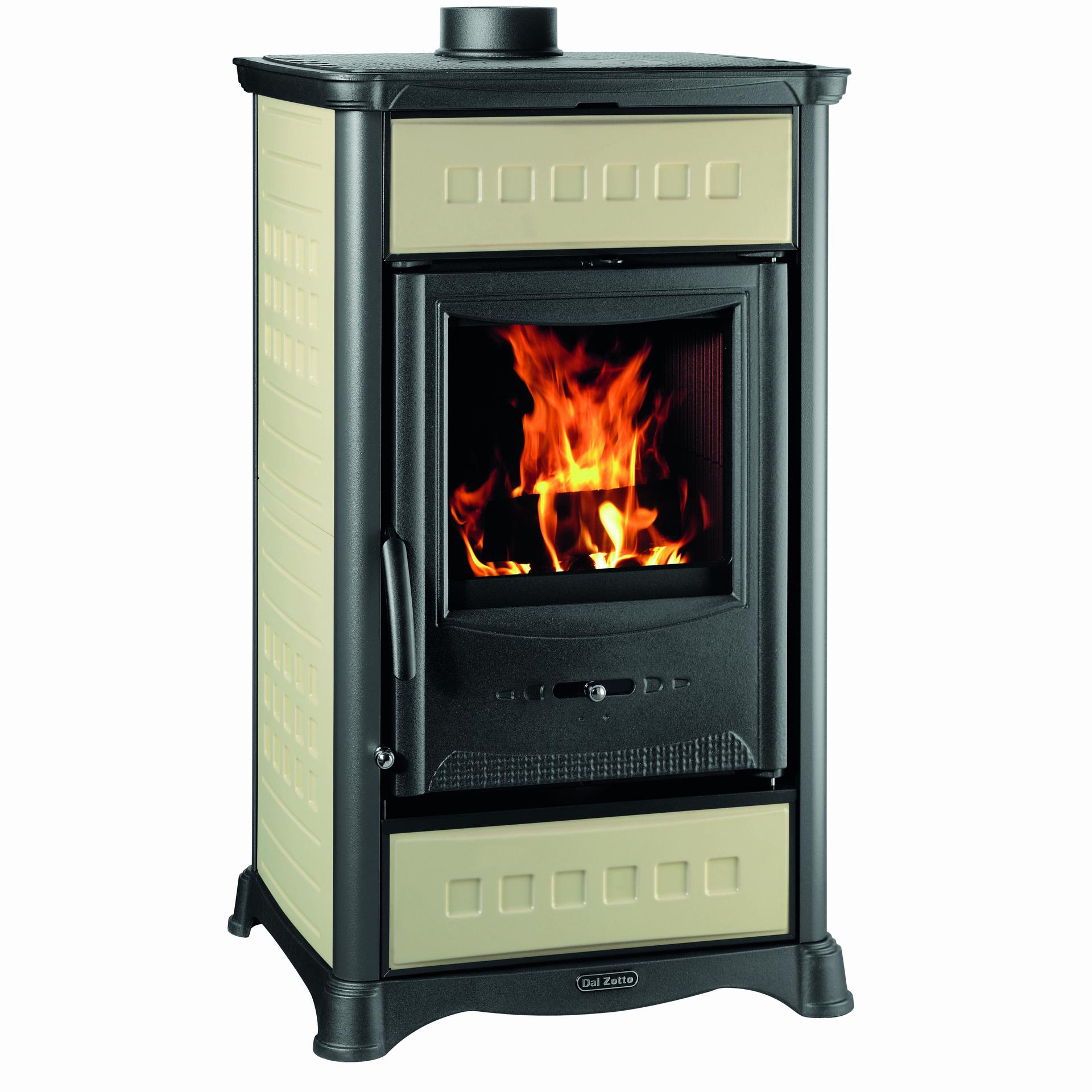 Peč na drva z zunanjo oblogo iz majolike. Primarni in sekundarni zrak ter dvojno izgorevanje. Velik predal za drva. Kuhalna plošča, podnožje in vrata iz emajliranega litega železa.