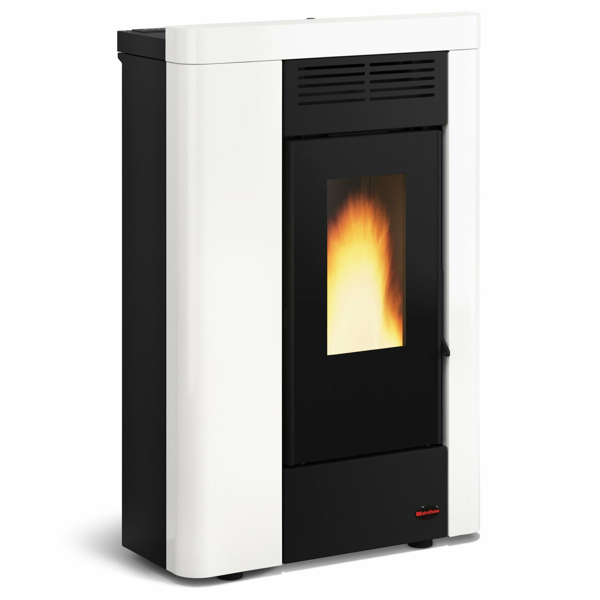 Kaminska peč na pelete s priklopom na razvod toplega zraka iz lakiranega jekla z daljinskim upravljalnikom in tedenskim nastavljivim termostatom.