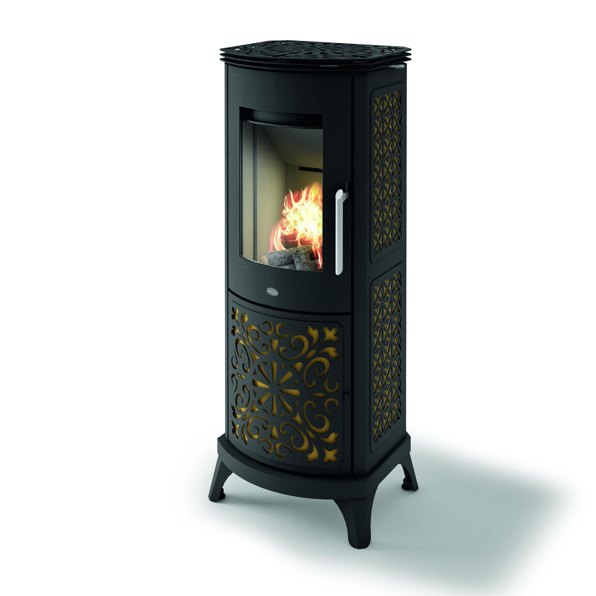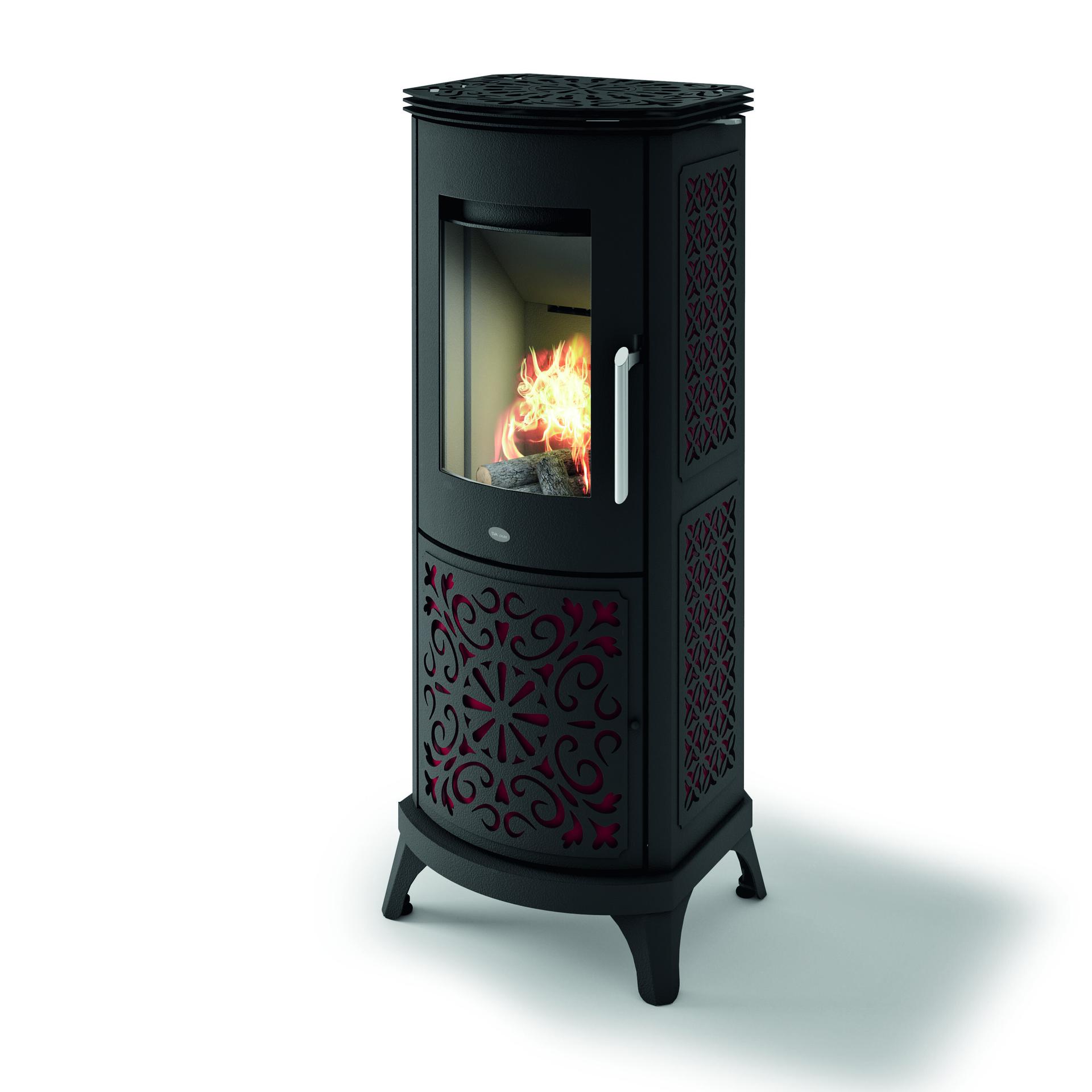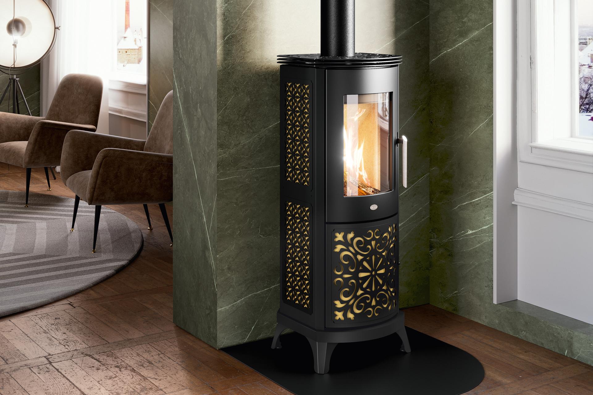 Peč z edinstveno zasnovo in hermetičnim sistemom zgorevanja. V jekleno oblogo so vgrajeni dragoceni vložki.