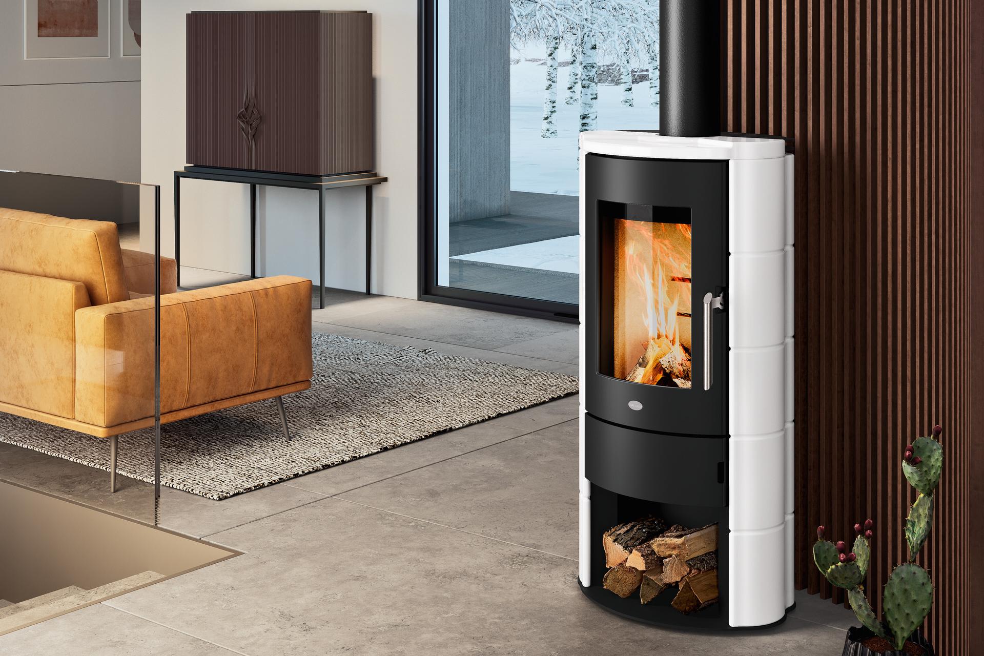 Peč na drva z ukrivljenimi vrati, 6 mm debelim pokrovom in oblogo iz majolike. Zgorevalna komora iz vermikulita in nadzor dovoda zraka.