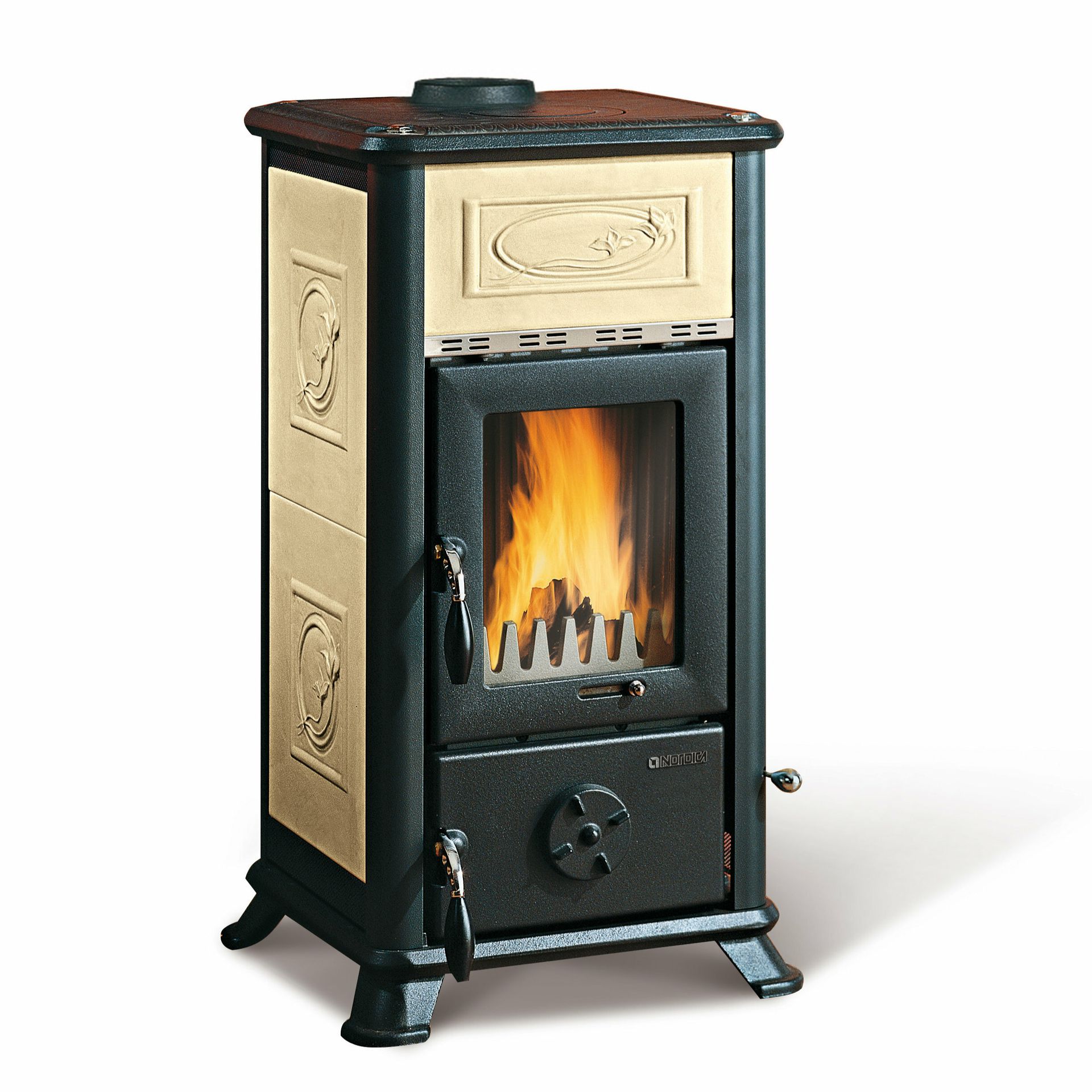 Peč na drva z zunanjo oblogo iz majolike ali naravnega kamna. Vrata in zgornji del ohišja iz emajliranega litega železa. Notranja obloga kurišča iz litega železa.