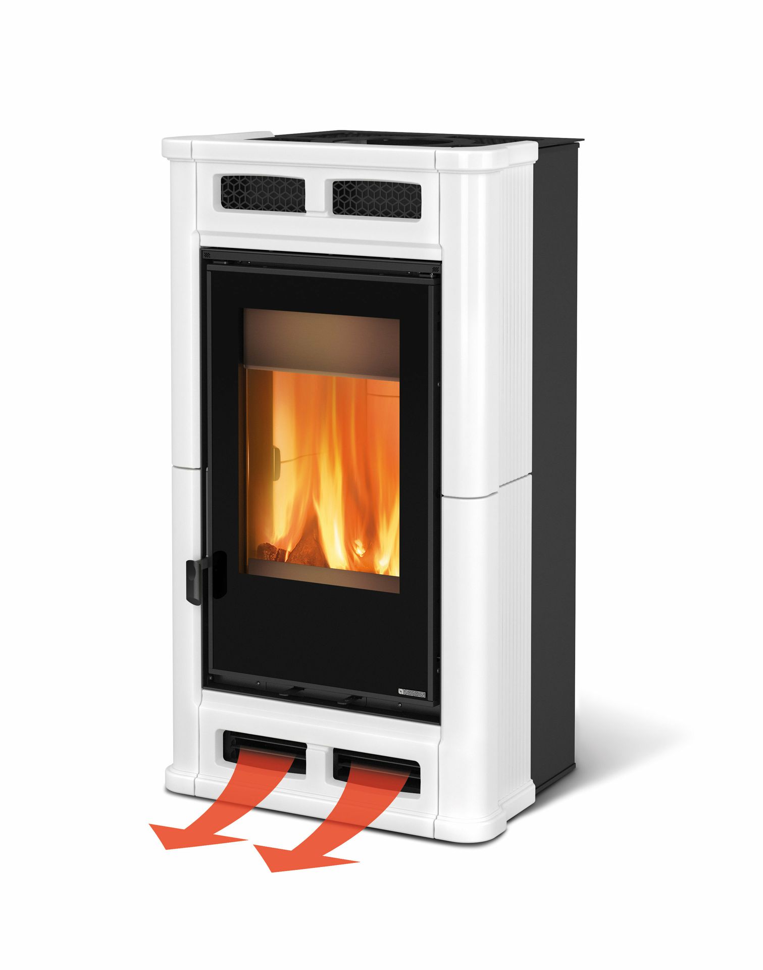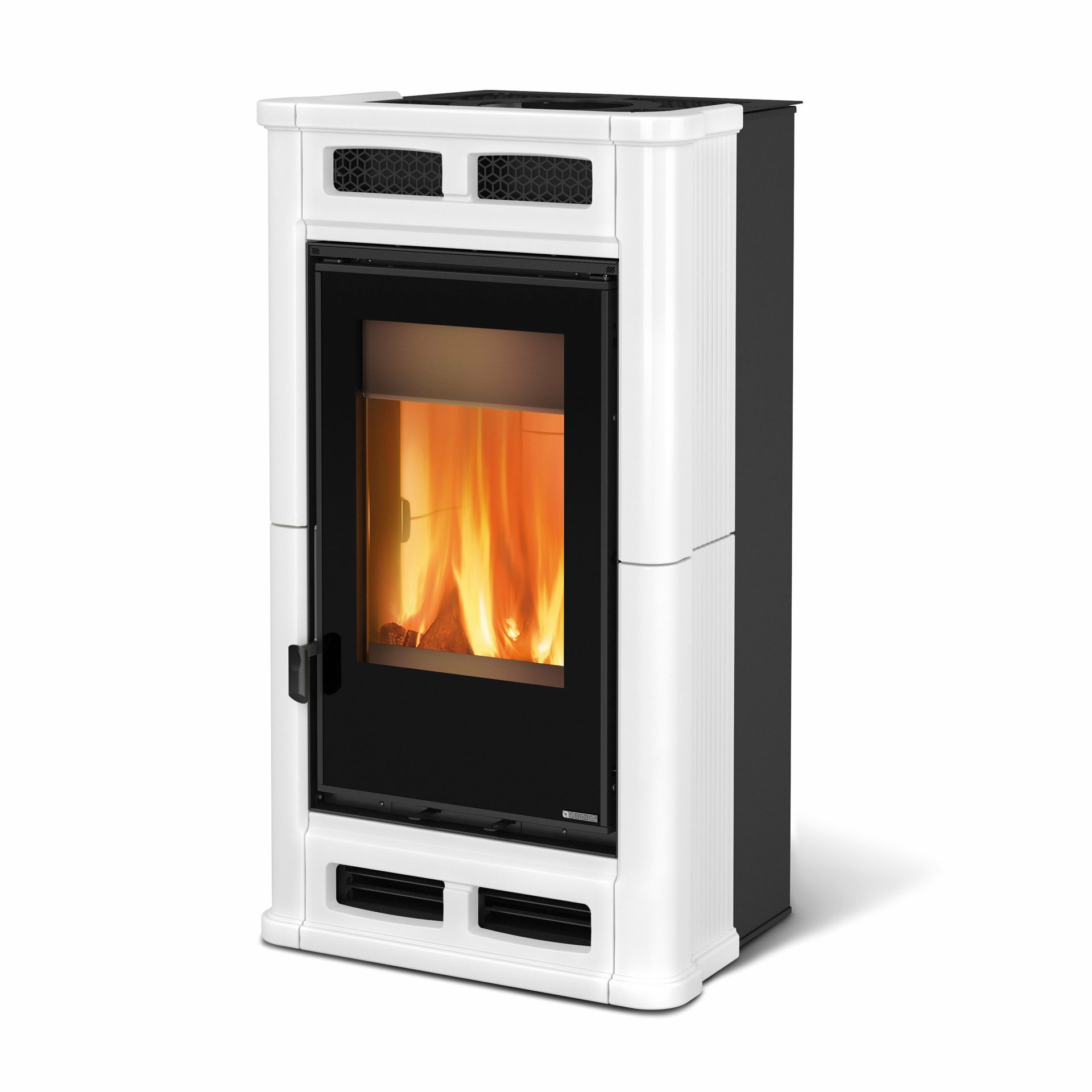 Ventilirana peč na drva z ročno izdelano oblogo iz majolike in sistemom PRS. Nastavljiva hitrost vpiha toplega zraka. Vrata, zgornji del, podnožje in okvir iz emajliranega litega železa. Notranja obloga kurišča iz litega železa in Nordikerja. Navpično ognjišče z navpičnim plamenom.