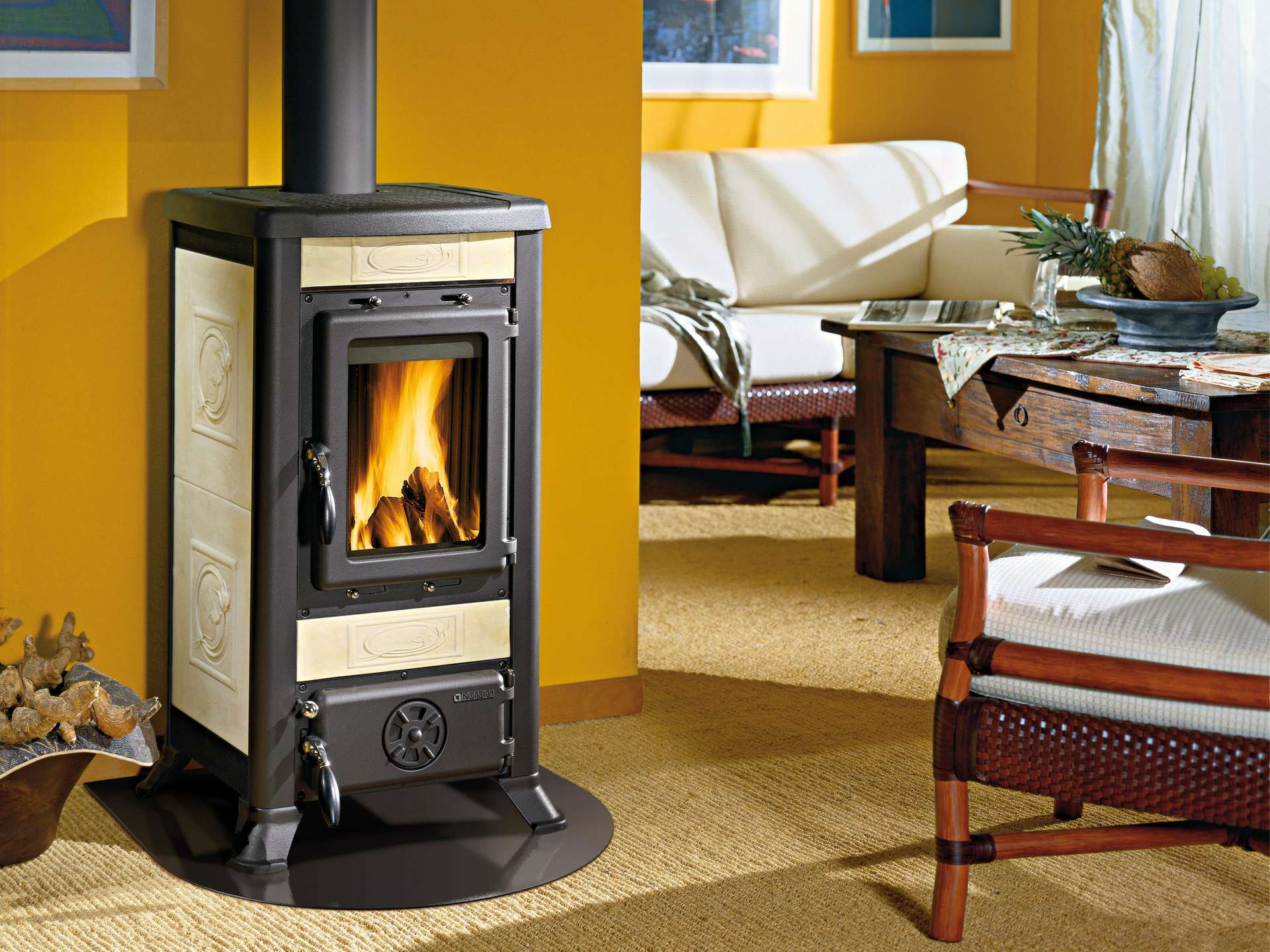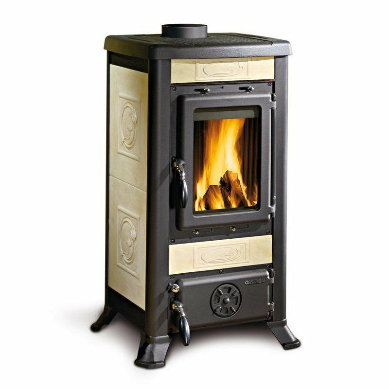Peč na drva z zunanjo oblogo iz majolike ali naravnega kamna. Vrata, zgornji del ohišja in okvir iz emajliranega litega železa. Notranja obloga kurišča iz litega železa. Keramično steklo.