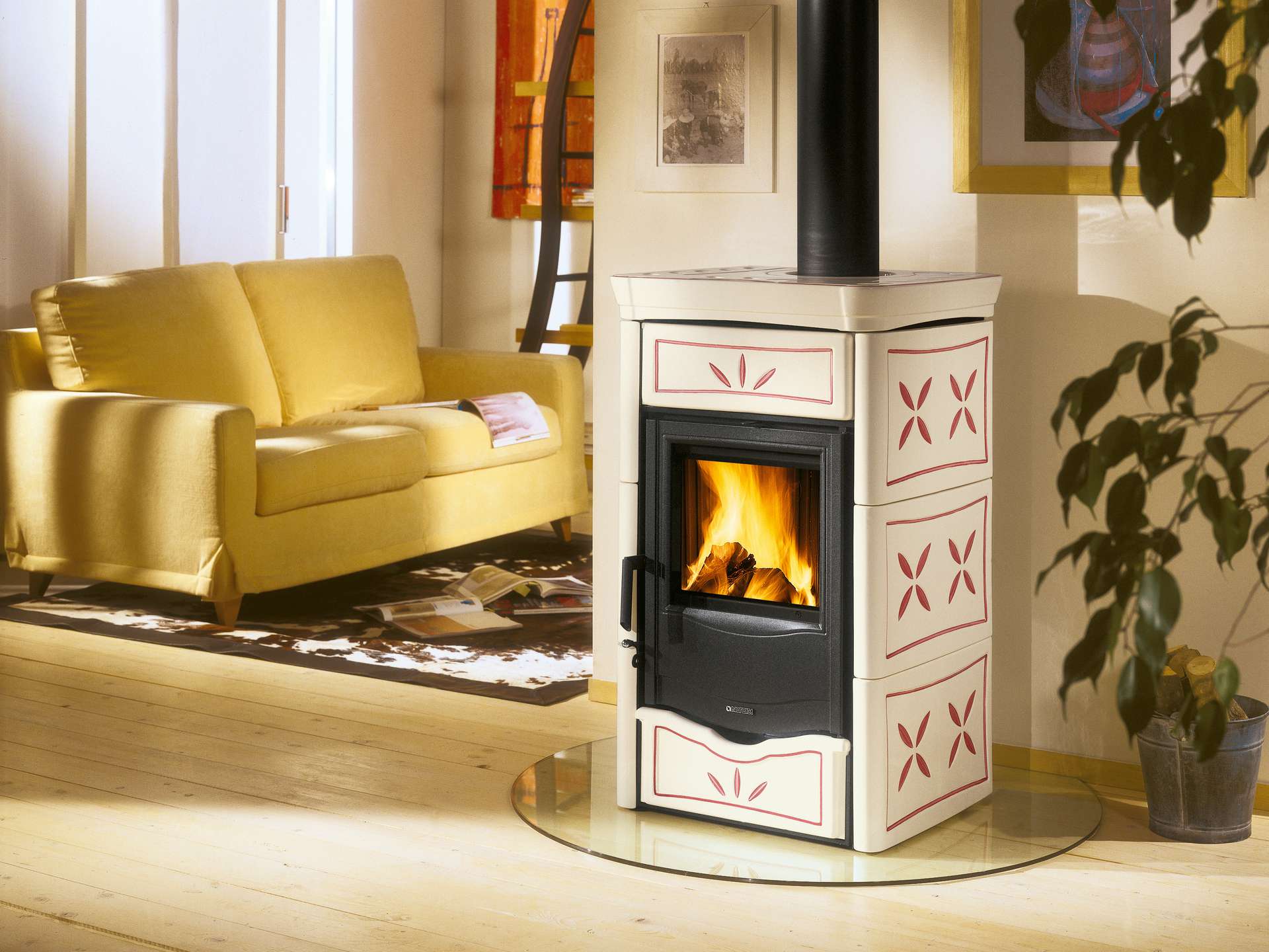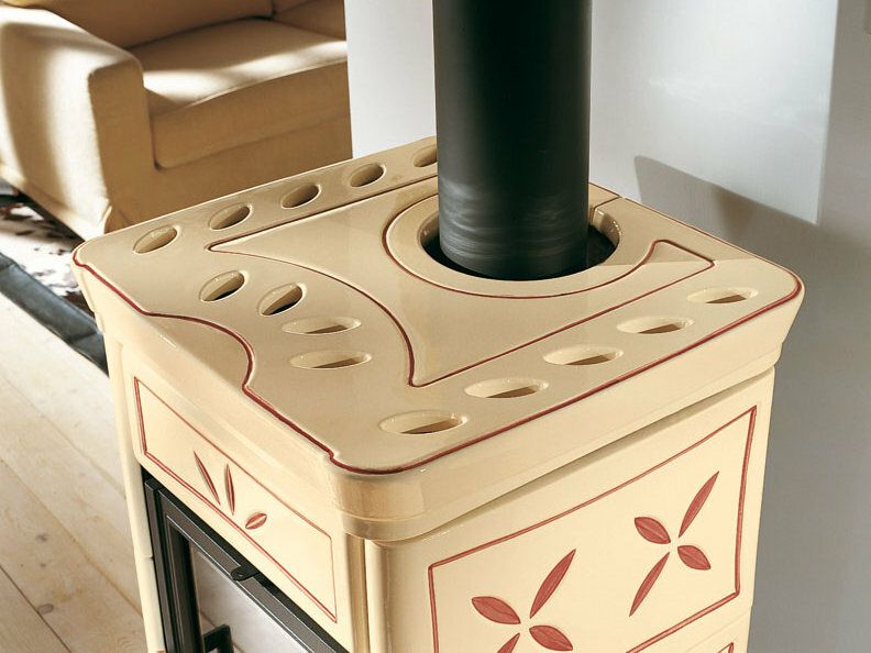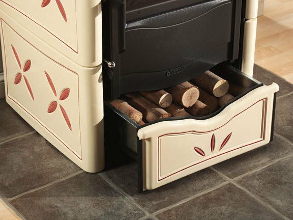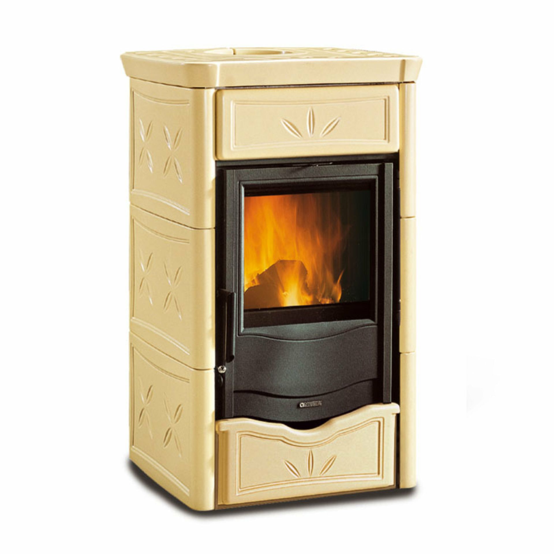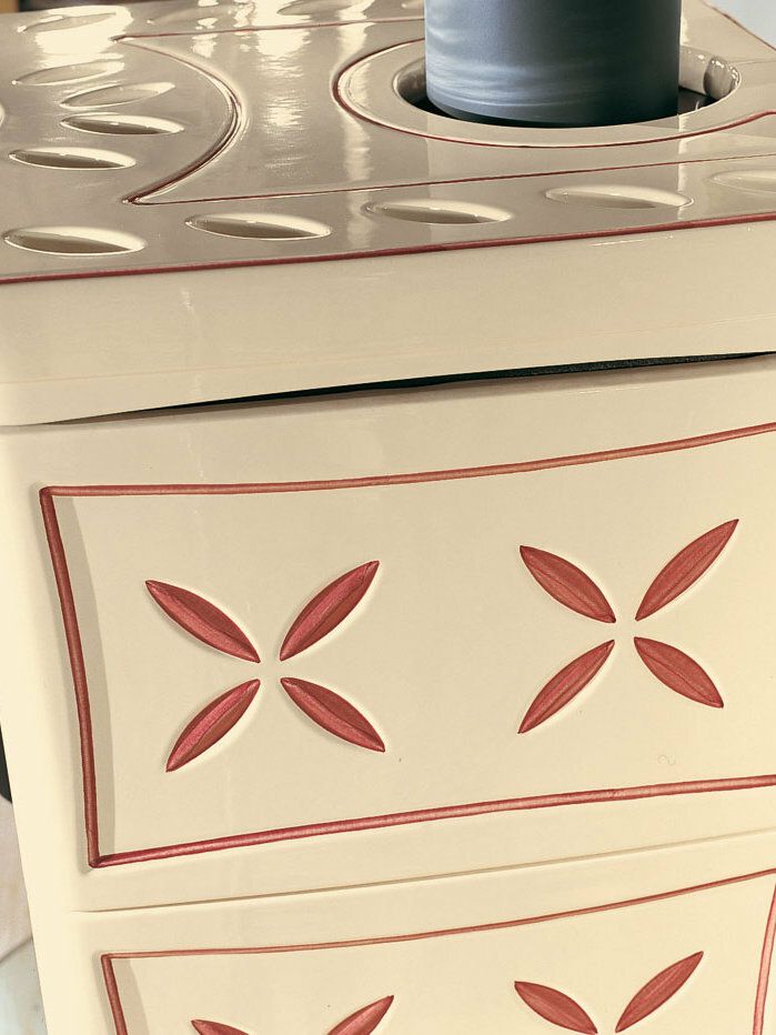 Peč na drva z ročno izdelano oblogo iz majolike. Vrata iz emajliranega litega železa. Notranja obloga kurišča iz litega železa. Keramično steklo s širokim pogledom na ogenj.