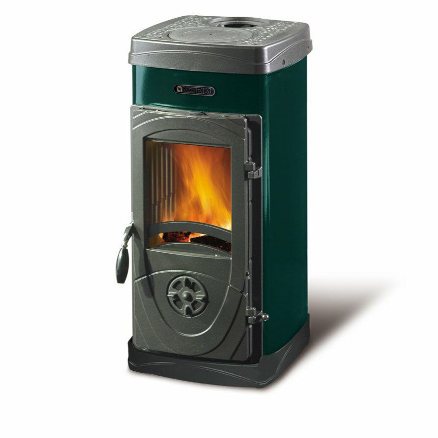 Peč na drva z vrati, zgornjim delom, podstavkom in okvirjem iz emajlirane litine. Pretresalnik rešetke. Kromirani medeninasti ročaji.