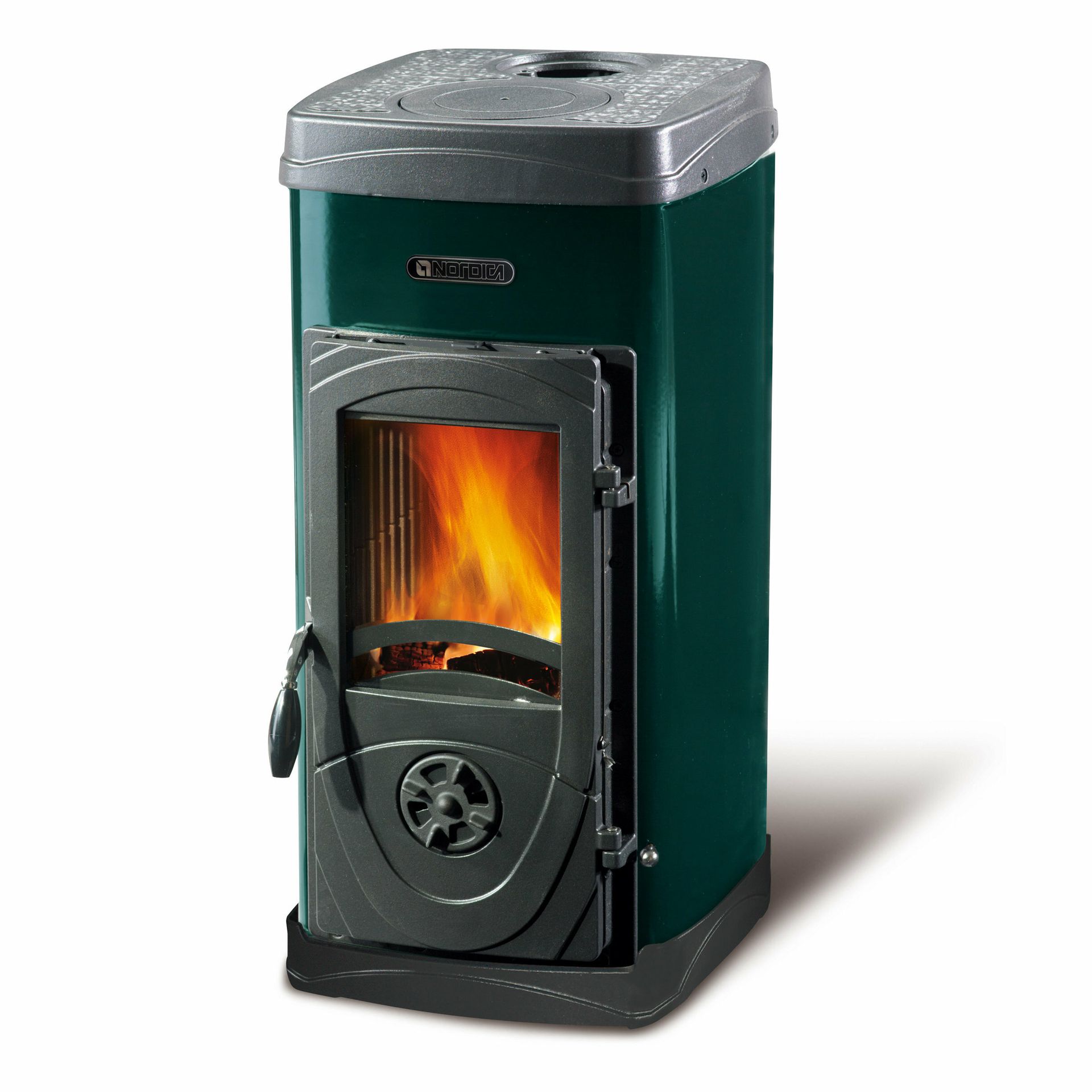 Peč na drva z vrati, zgornjim delom, podstavkom in okvirjem iz emajlirane litine. Notranja obloga kurišča iz litega železa. Pretresalnik rešetke. Kromirani medeninasti ročaji.