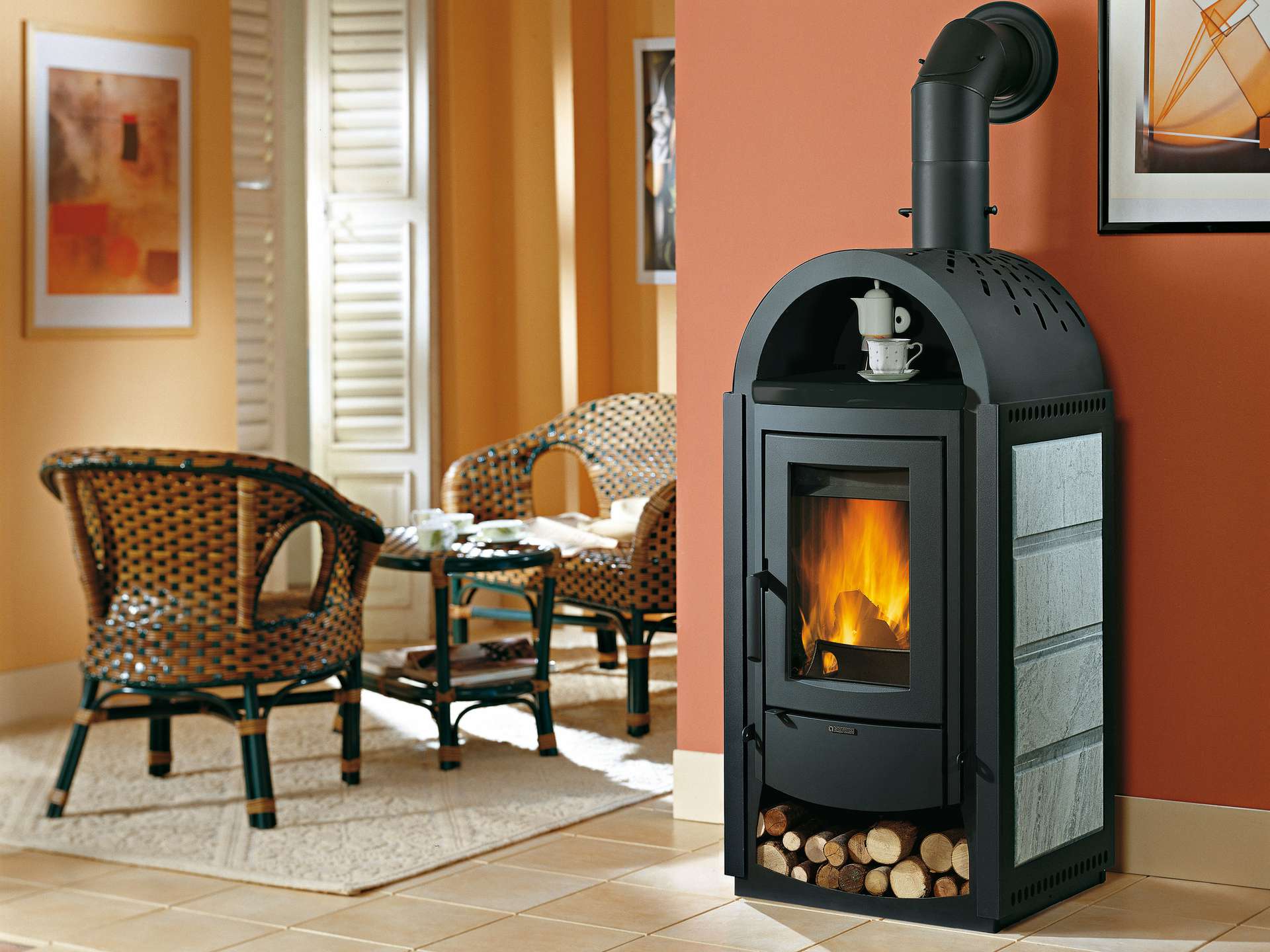 Peč na drva s predalom za segrevanje hrane in oblogo iz barvanega jekla in majolike ali naravnega kamna. Držalo za polena. Notranja obloga kurišča iz litega železa. Keramično steklo in širok pogled na ogenj.