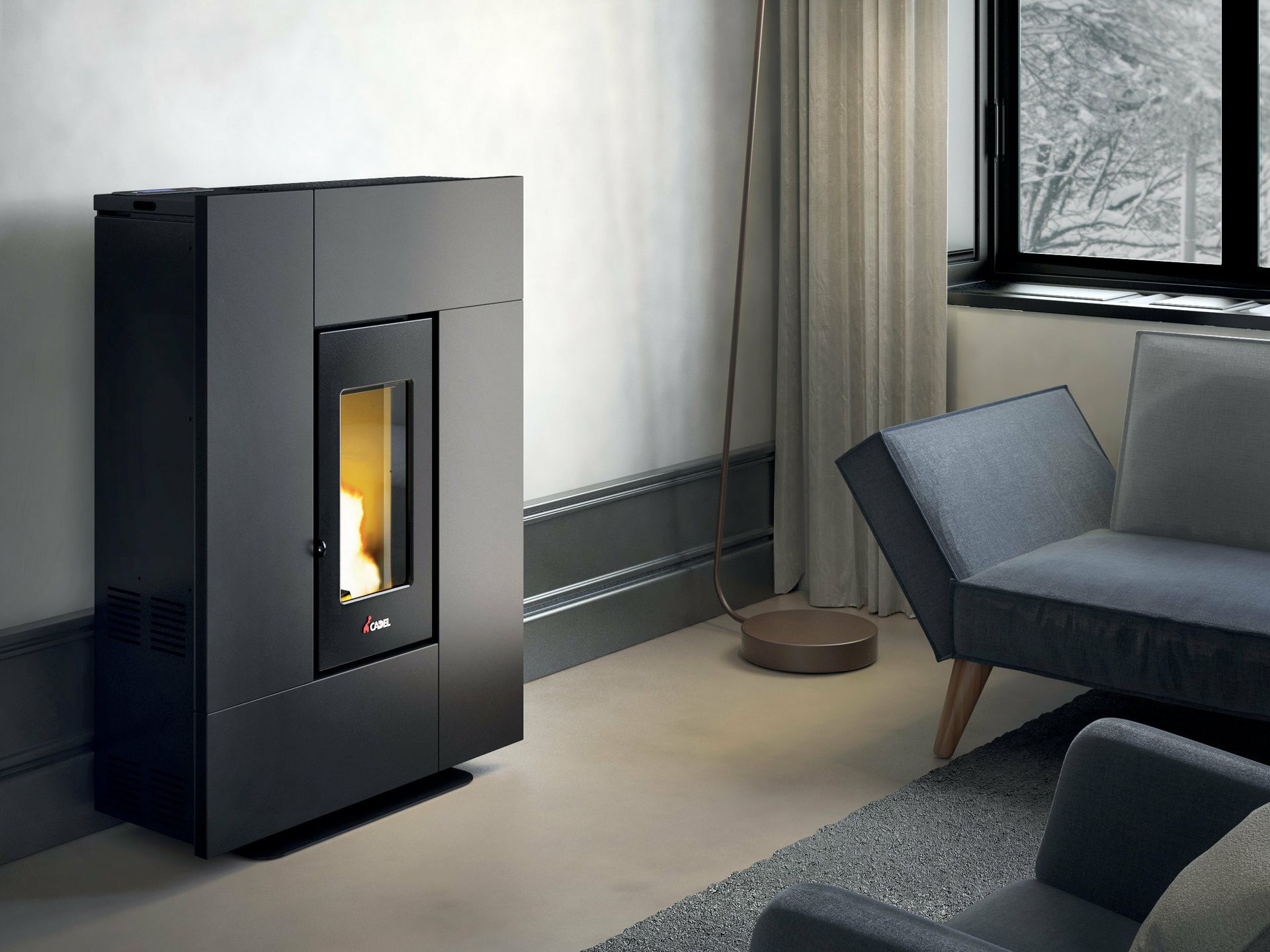 Peč na pelete, ki obogati prostor. Zaradi elegantne in sodobne zasnove z globino le 27,5 cm je še posebej primerna za manjše prostore.