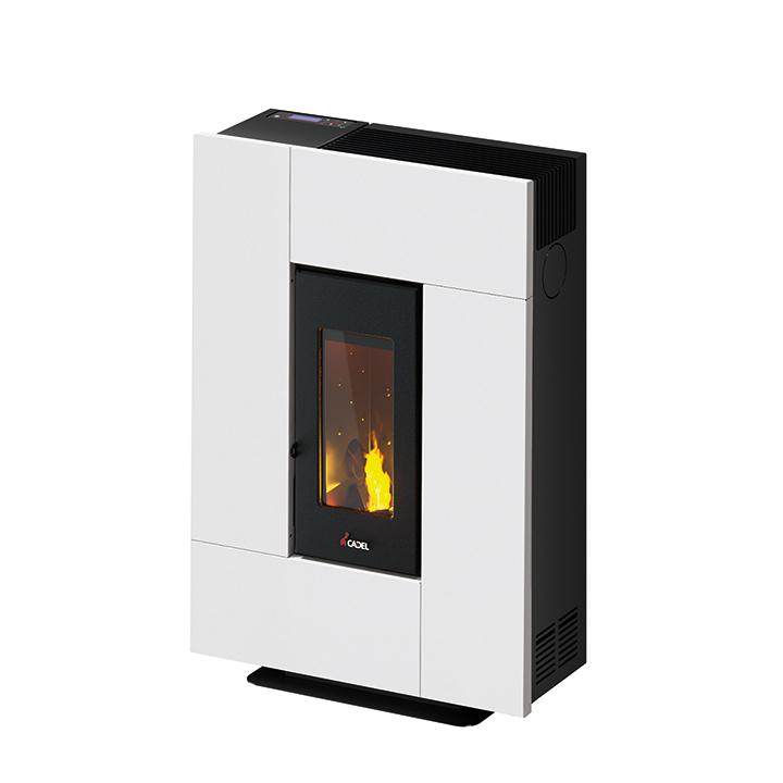 A pellet stove that decorates. The elegant and contemporary design of this stove makes it particularly suitable for small spaces, thanks to its depth of only 27.5 cm. Available as part of a practical kit for wall-to-wall installation. The cover is made of painted steel.