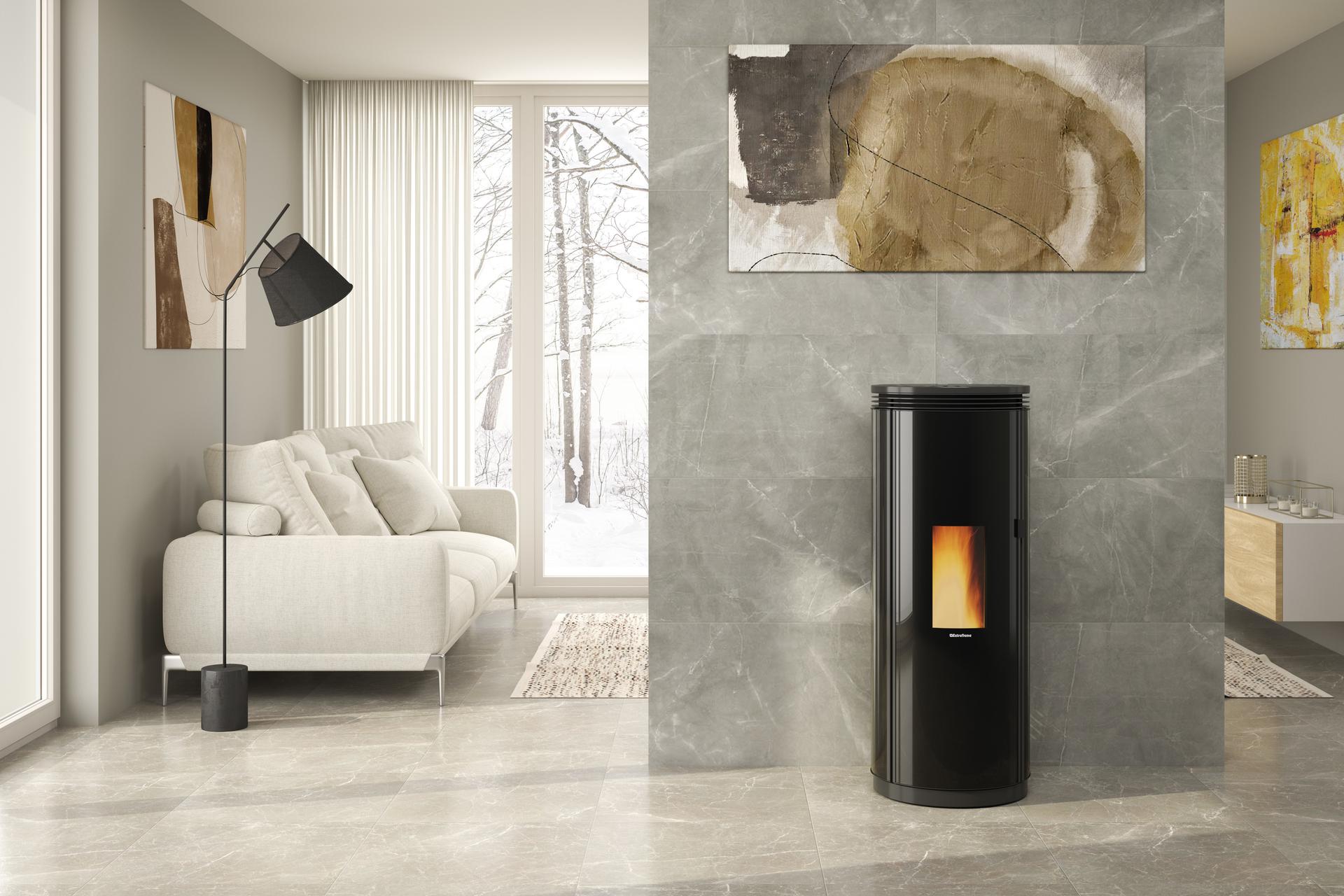 Peč na pelete La Nordica Extraflame Pamela z zaobljeno obliko in elegantnimi linijami predstavlja prestižno zasnovo. Sprednja vrata so dvojna, od katerih so zunanja opremljena z ukrivljenim kaljenim steklom in tako zaključujejo vizualno popolnost.