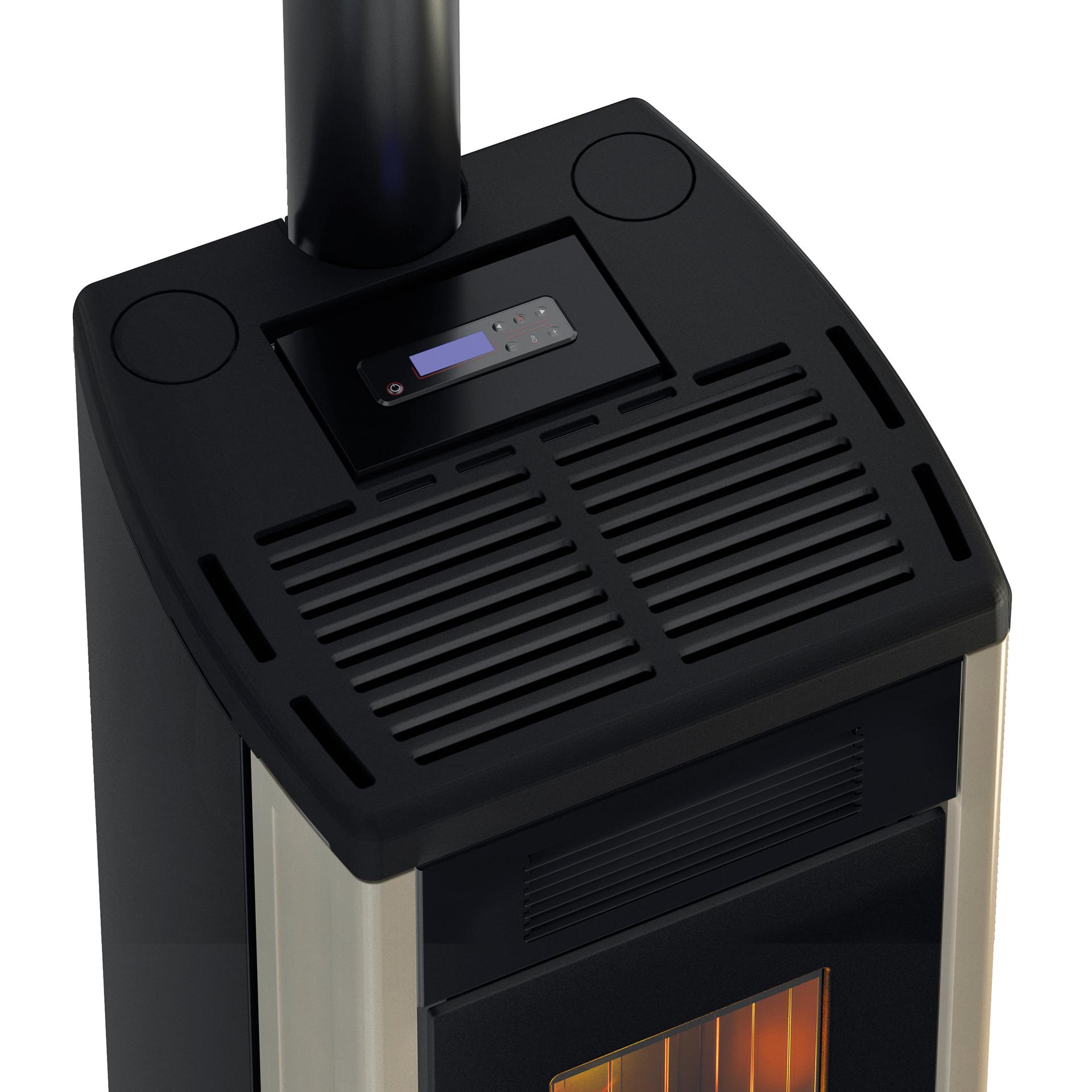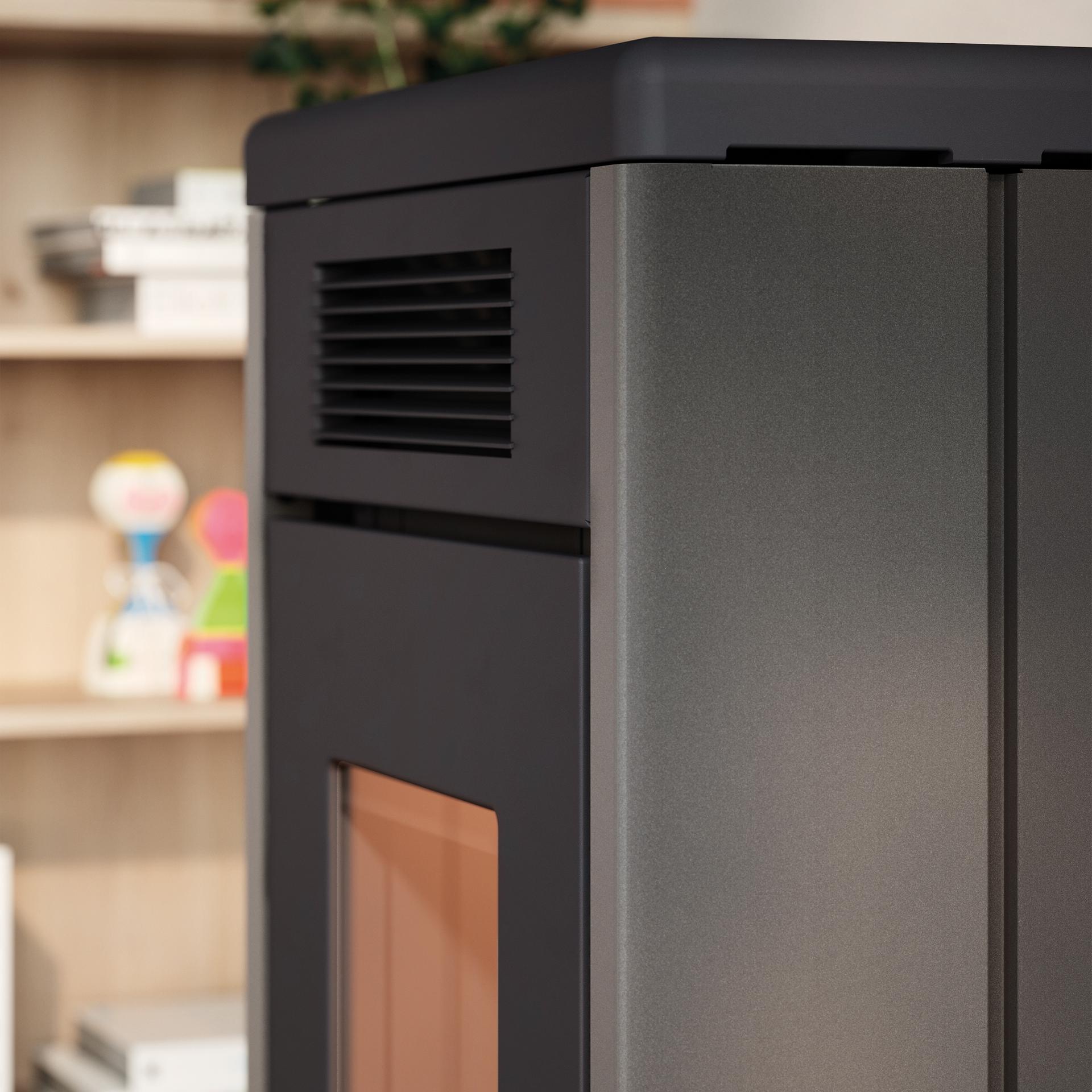 Hermetična peč na pelete z dvojnimi neodvisno krmiljenimi kanali za razvod toplega zraka. Zgorevalna komora, zgornji del in vrata so izdelani iz litega železa. Vgrajen Wi-Fi vmesnik za daljinsko upravljanje. Vsestranska, mogoče jo je namestiti s priklopom na zgornji ali zadnji dimniški priključek. Prevleka iz pobarvanega jekla.