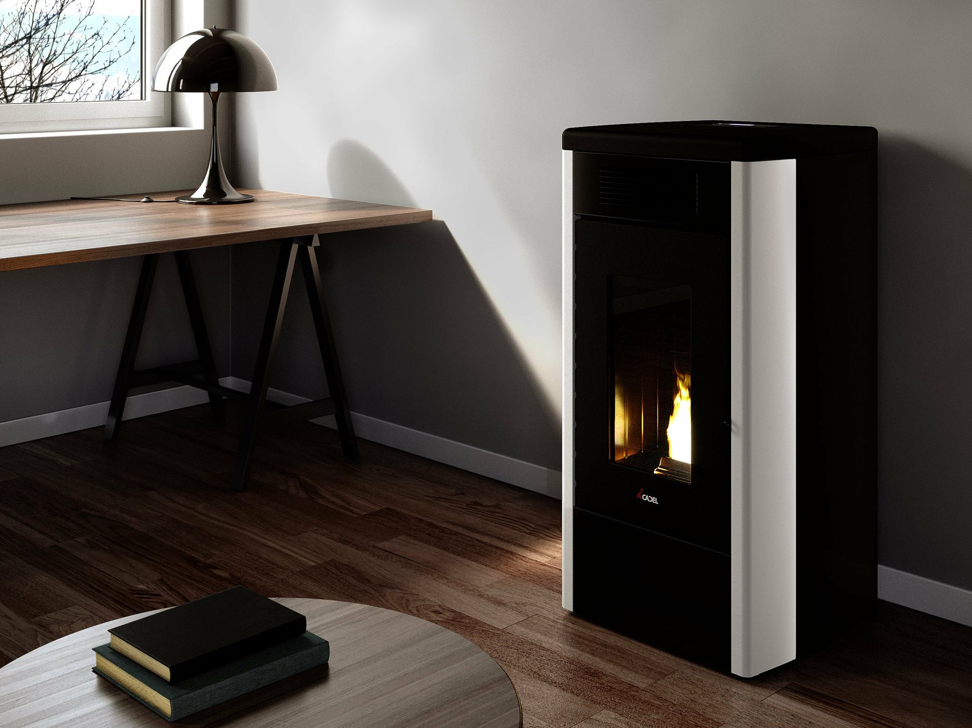 Hermetična peč na pelete z dvojnimi neodvisno krmiljenimi kanali za razvod toplega zraka. Zgorevalna komora, zgornji del in vrata so izdelani iz litega železa. Vgrajen Wi-Fi vmesnik za daljinsko upravljanje. Vsestranska, mogoče jo je namestiti s priklopom na zgornji ali zadnji dimniški priključek. Prevleka je iz pobarvanega jekla z vgrajenimi elementi iz majolike.
