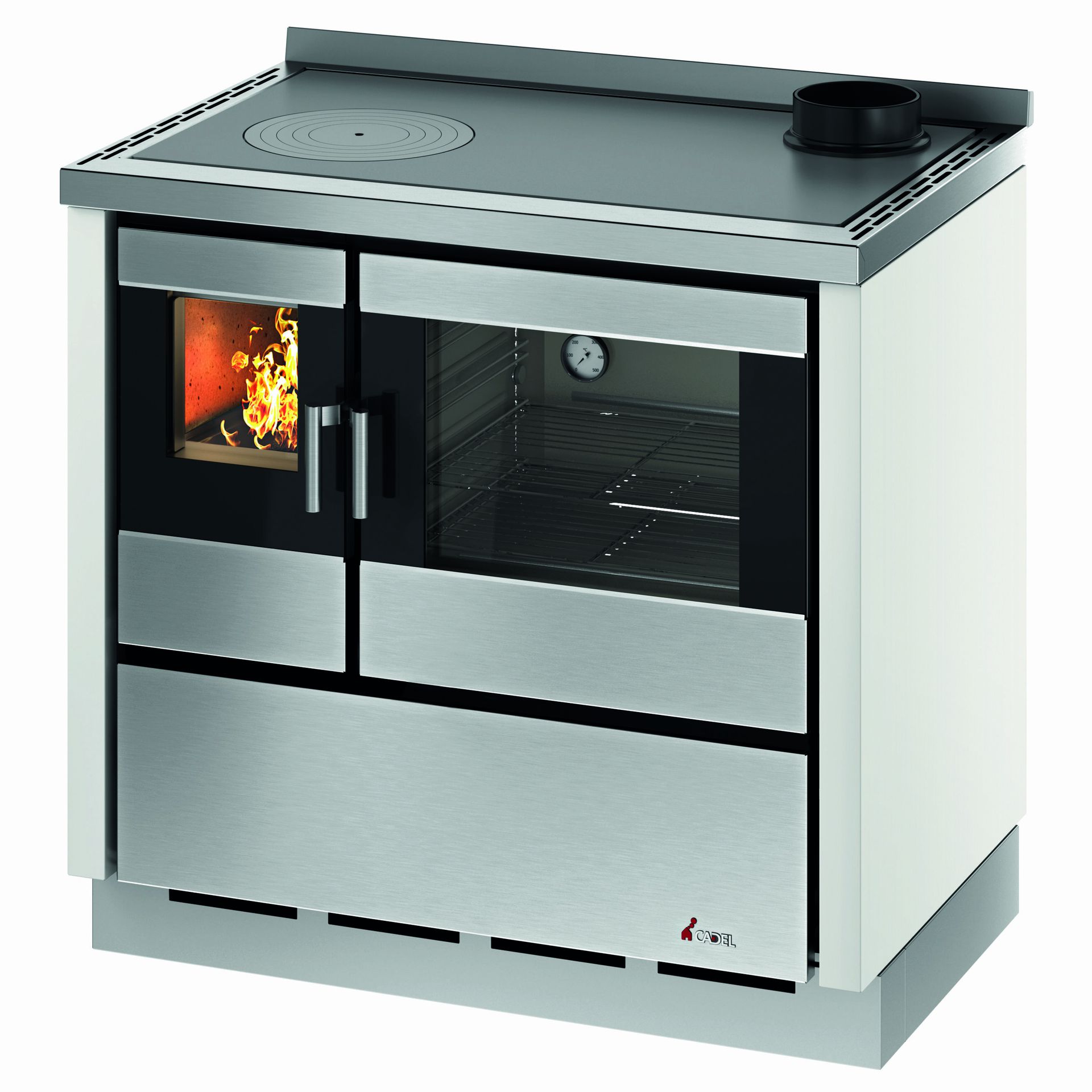 Ta vgradni štedilnik na drva odlikujejo prostor, namenjen pečici, široko steklo, skozi katerega lahko vidite, kako poteka peka, in široko kurišče, da imate vse pod nadzorom. Velika pečica iz nerjavnega jekla zagotavlja enakomerno peko hrane, aparat pa je enostaven za čiščenje, medtem ko je kuhalna plošča, ki je serijsko izdelana iz litega železa, na voljo tudi v steklokeramični različici.