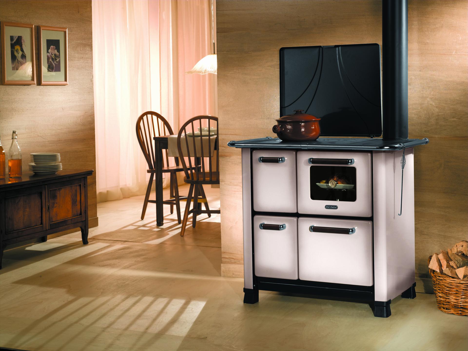 Štedilnik na drva s porcelanasto jekleno oblogo. Termometer z žarnico, emajlirana pečica in pladenj.