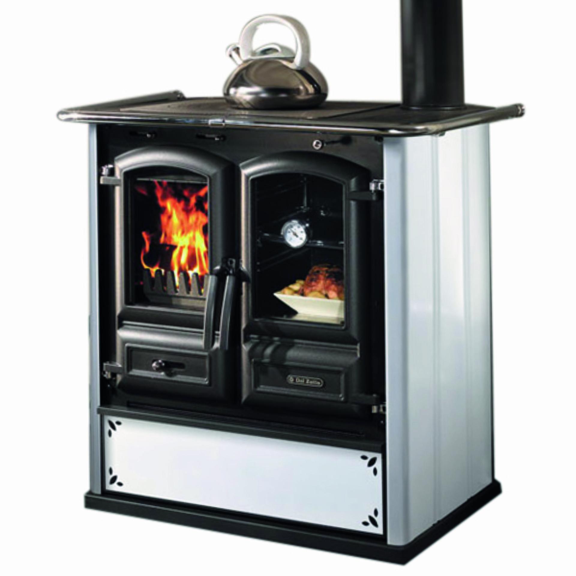 Štedilnik na drva z jekleno oblogo. Veliko ognjišče iz litega železa s panoramskimi vrati iz litega železa in keramičnim steklom. Panoramska pečica in velik predal za drva. Litoželezna plošča dvojne debeline.