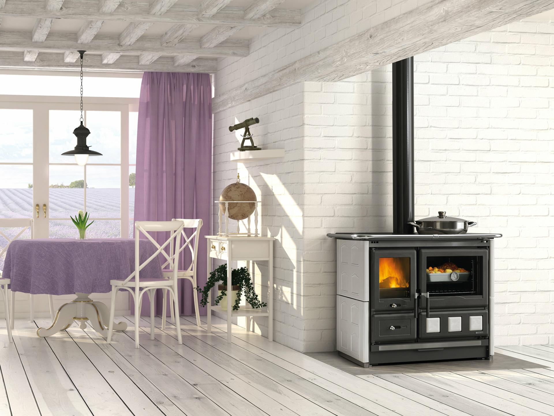Tradicionalni štedilnik na drva z ročno izdelano oblogo iz majolike. Zgornja kuhalna plošča in obroči iz poliranega litega železa. Notranja obloga kurišča iz litega železa in ognjevzdržnega materiala. Izvlečni predal za drva. Vrata kurišča iz litega železa z dvojnim steklom.