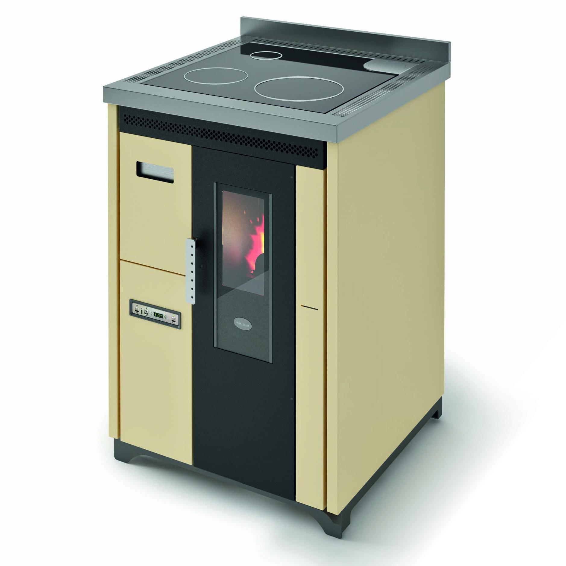 Štedilnik na pelete s kuhalno ploščo iz keramičnega stekla. Ventilatorski vpih toplega zraka je mogoče izklopiti, če ni potreben, npr. poleti. Izvlečni sprednji predal za enostavno nalaganje peletov. 10 (5+5) stopenj moči upravljate prek menijskega zaslona, ki je na voljo v 6 jezikih. Varnostni termostat in manostat z možnostjo priključitve zunanjega termostata. Priključek za dimnik na zadnji in zgornji strani, za boljše prilagajanje zahtevam namestitve.
